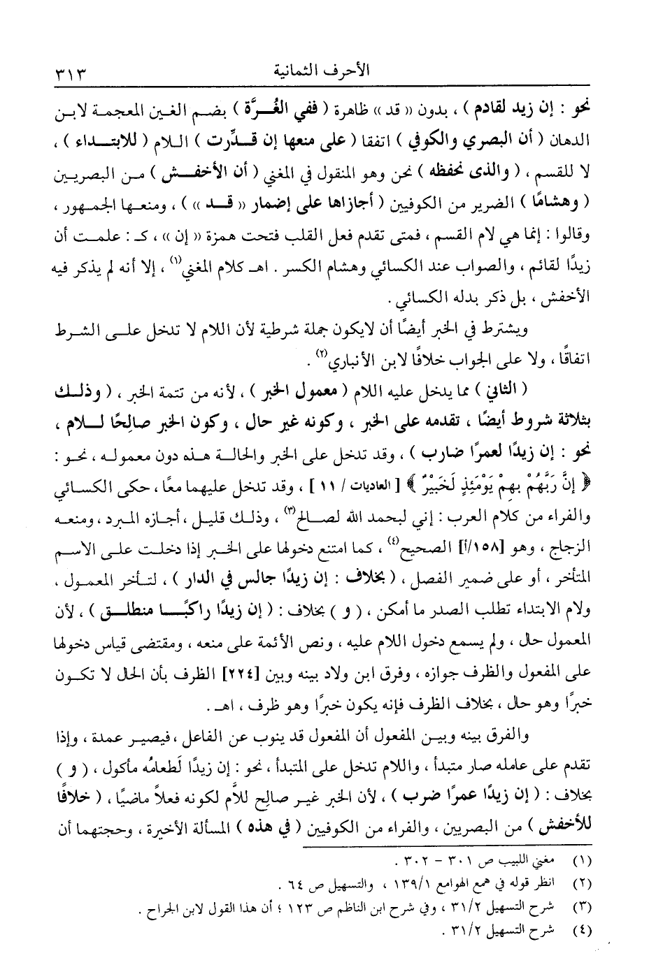 نحو: إن زيد لقادم"، بدون "قد" ظاهرة "ففي الغُرّة" بضم العين المعجمة لابن الدهان "أن البصري والكوفي" اتفقا "على منعها إن قدرت" اللام "للابتداء"، لا للقسم، "والذي نحفظه" نحن وهو المنقول في المغني "أن الأخفش" من البصريين، "وهشامًا" الضرير من الكوفيين "أجازاها على إضمار "قد""، ومنعها الجمهور، وقالوا: إنما هي لام القسم، فمتى تقدم فعل القلب فتحت همزة "إن"، كـ: علمت أن زيدًا لقائم، والصواب عند الكسائي وهشام الكسر. ا. هـ. كلام المغني1, إلا أنه لم يذكر فيه الأخفش، بل ذكر بدله الكسائي.
