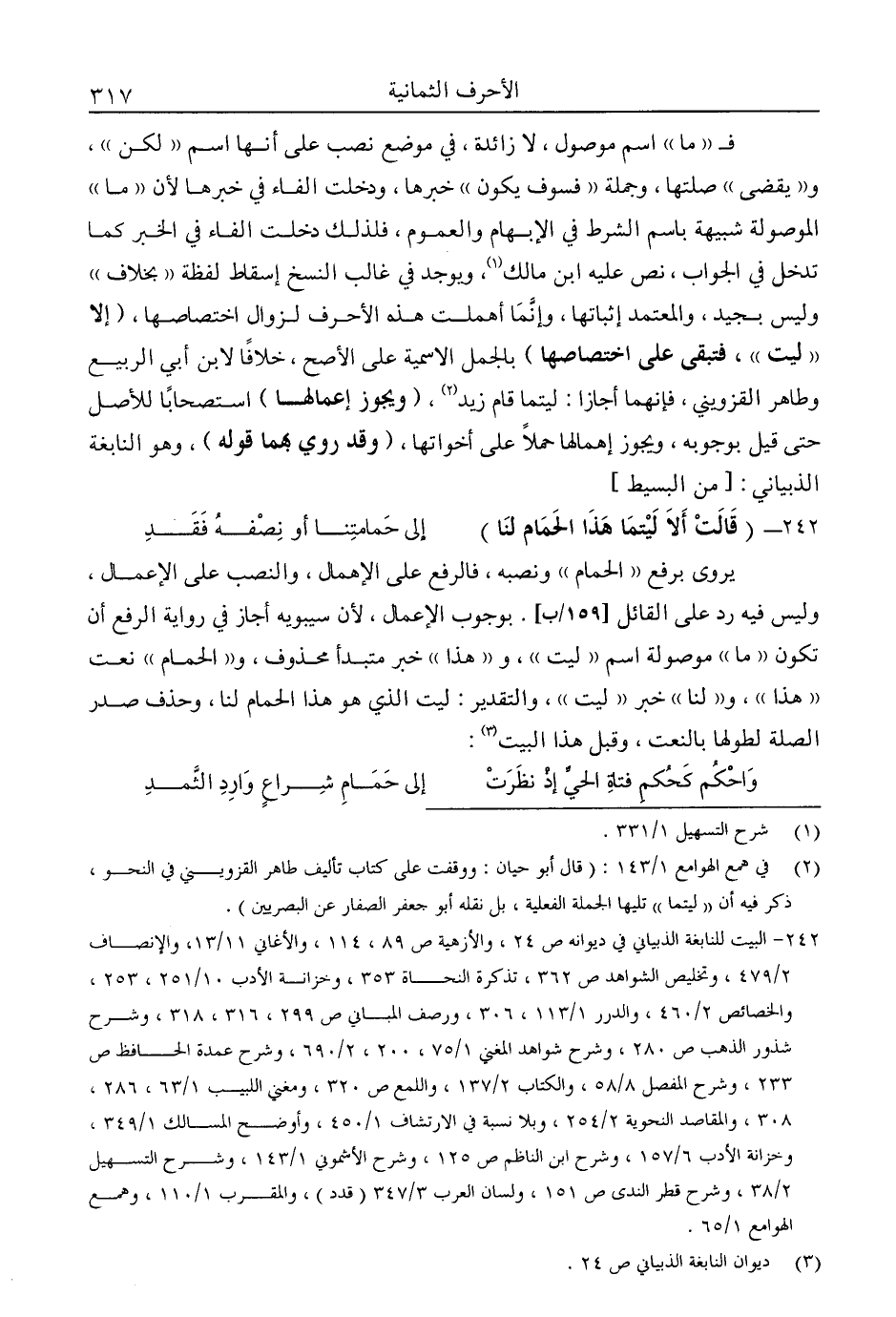 2 في همع الهوامع 1/ 143: "قال أبو حيان: ووقفت على كتاب تأليف طاهر القزويني في النحو، ذكر فيه أن "ليتما" تليها الجملة الفعلية، بل نقله أبو جعفر الصفار عن البصريين".