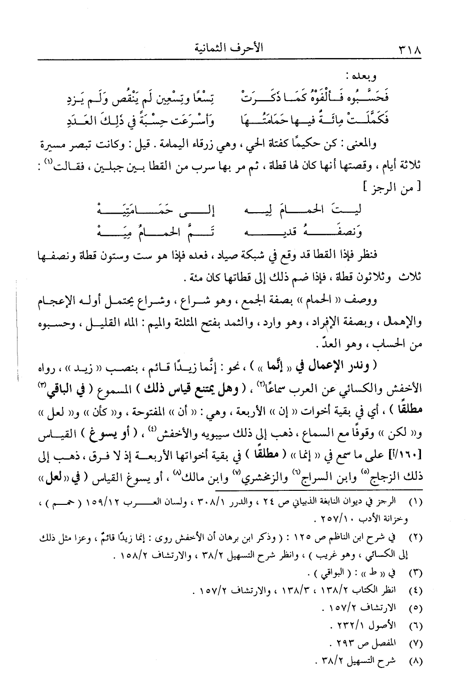 ووصف "الحمام" بصفة الجمع، وهو شراع، وشراع يحتمل أوله الإعجام والإهمال، وبصفة الإفراد وهو وارد، والثمد بفتح المثلثة والميم: الماء القليل، وحسبوه من الحساب، وهو العد.