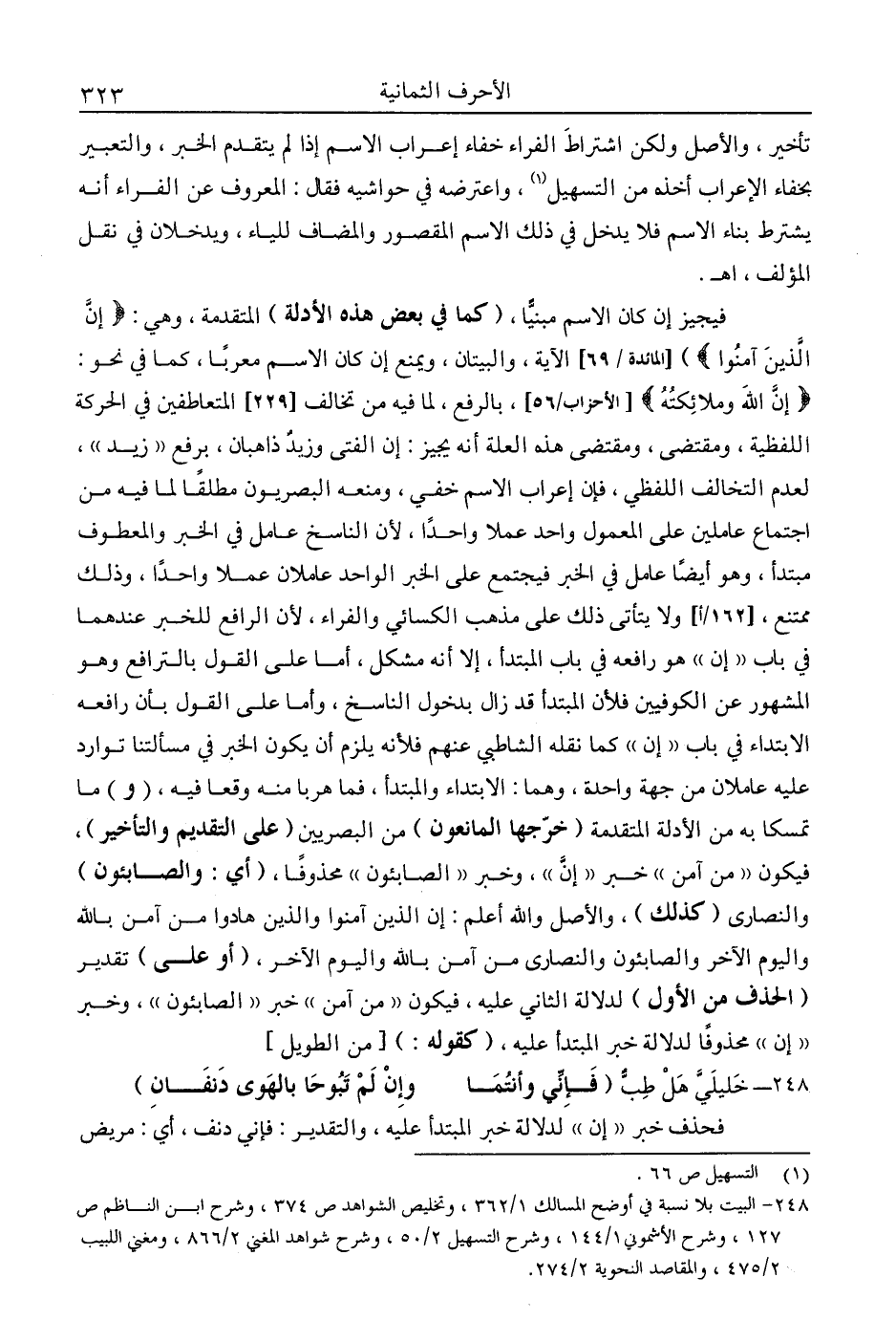 248- البيت بلا نسبة في أوضح المسالك 1/ 362، وتخليص الشواهد ص374، وشرح ابن الناظم ص127، وشرح الأشموني 1/ 144، وشرح التسهيل 2/ 50، وشرح شواهد المغني 2/ 866، ومغني اللبيب 2/ 475، والمقاصد النحوية 2/ 274.