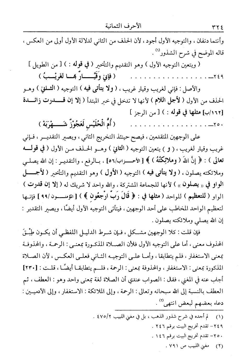 فإن قلت: كلا الوجهين مشكل، فإن شرط الدليل اللفظي أن يكون طبق المحذوف معنى، أما على التوجيه الأول؛ فلأن الصلاة المذكورة بمعنى: الرحمة، والمحذوفة بمعنى الاستغفار، فلم ينطابقا، وأما على التوجيه الثاني فعلى العكس؛ لأن الصلاة المذكورة بمعنى: الاستغفار، والمحذوفة بمعنى: الرحمة، فلم يتطابقا أيضًا، قلت: أجاب عنه في المغني فقال: الصواب عندي أن الصلاة لغة بمعنى واحد وهو: العطف، ثم العطف بالنسبة إلى الله سبحانه وتعالى: الرحمة، وإلى الملائكة: الاستغفار، وإلى الآدميين: دعاء بعضهم لبعض. ا. هـ2.