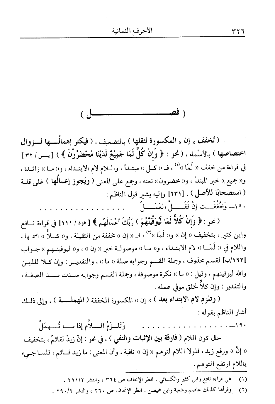 "تخفف "إن" المكسورة لثقلها" بالتضعيف، "فيكثر إهمالها لزوال اختصاصها" بالأسماء، "نحو: "وَإِنْ كُلٌّ لَمَا جَمِيعٌ لَدَيْنَا مُحْضَرُونَ" [يس: 32] في قراءة من خفف "لما"1، فـ"كل" مبتدأ، واللام لام الابتداء، و"ما" زائدة و"جميع" خبر المبتدأ، و"محضرون" نعته، وجمع على المعنى "ويجوز إعمالها" على قلة "استصحابًا للأصل" وإليه يشير قول الناظم: