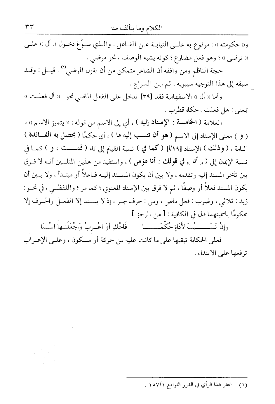 العلامة "الخامسة: الإسناد إليه"، أي: إلى الاسم من قوله: "يتميز الاسم"، "و" معنى الإسناد إلى الاسم "هو أن تنسب إليه ما"، أي: حكما "يحصل به الفائدة" التامة، "وذلك" الإسناد "كما في" نسبة القيام إلى تاء "قمت, و" كما في نسبة الإيمان إلى ""أنا" في قولك: أنا مؤمن"، واستفيد من هذين المثلين أنه لا فرق بين تأخر المسند إليه وتقدمه، ولا بين أن يكون المسند إليه فاعلا أو مبتدأ، ولا بين أن يكون المسند فعلا أو وصفا، ثم لا فرق بين الإسناد المعنوي، كما مر؛ واللفظي، في نحو: زيد: ثلاثي، وضرب: فعل ماض، ومن: حرف جر، إذ لا يسند إلا الفعل والحرف إلا محكوما باسميتهما قال في الكافية: [من الرجز]