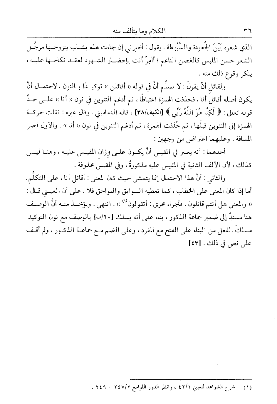 والثاني: أن هذا الاحتمال إنما يتمشى حيث كان المعنى: أقائل أنا، على التكلم. أما إذا كان المعنى على الخطاب، كما تعطيه السوابق واللواحق فلا. على أن العيني قال: "والمعنى هل أنتم قائلون، فأجراه مجرى: أتقولون1". ا. هـ. ويؤخذ منه أن الوصف هنا مسند إلى ضمير جماعة الذكور، بناء على أنه يسلك بالوصف مع نون التوكيد مسلك الفعل من البناء على الفتح مع المفرد، وعلى الضم مع جماعة الذكور، ولم أقف على نص في ذلك.