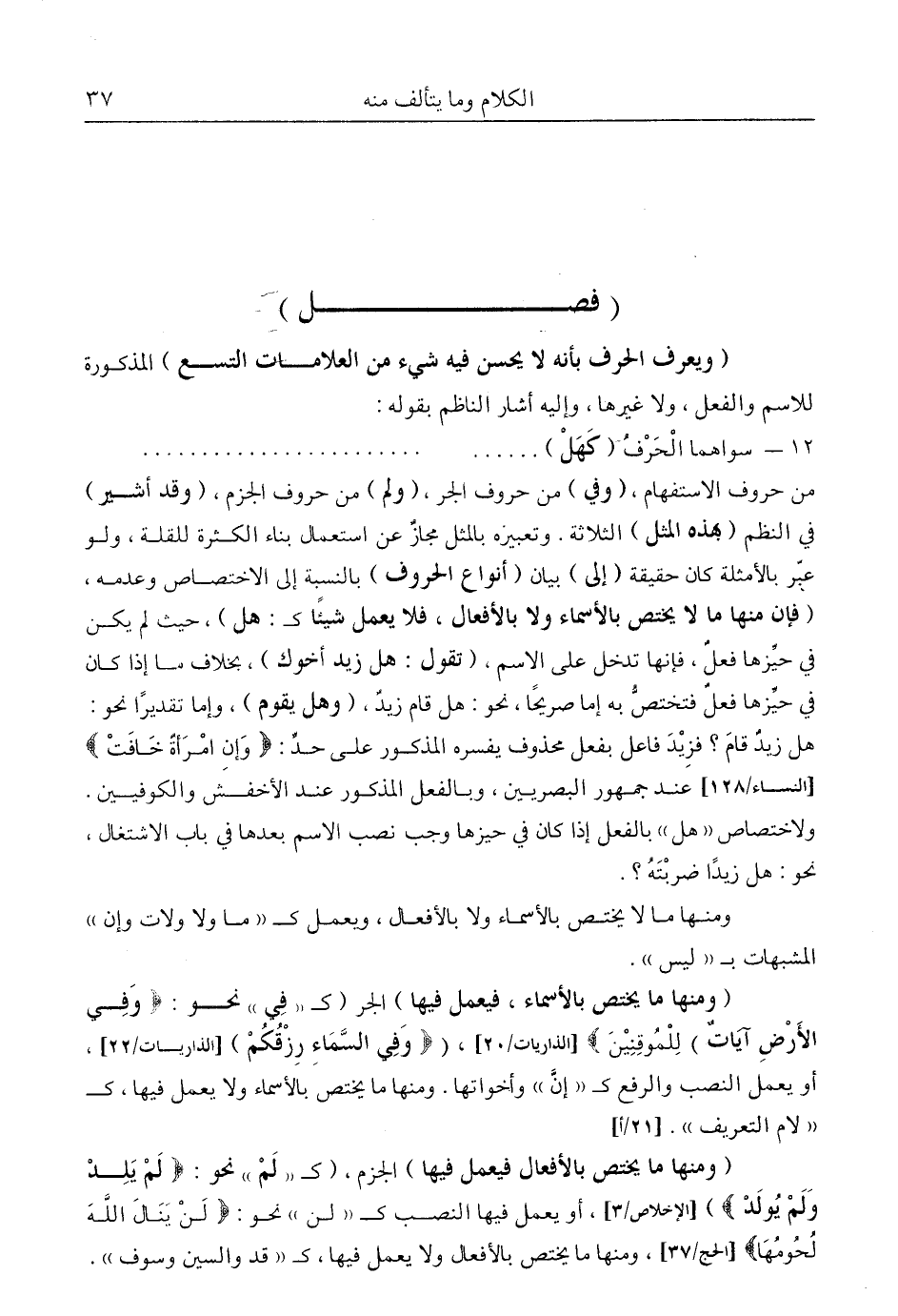 "ومنها ما يختص بالأفعال فيعمل فيها" الجزم، "كـ"لم" نحو: {لَمْ يَلِدْ وَلَمْ يُولَدْ} " [الإخلاص: 3] ، أو يعمل فيها النصب كـ "لن" نحو: {لَنْ يَنَالَ اللَّهَ لُحُومُهَا} [الحج: 37] ، ومنها ما يختص بالأفعال ولا يعمل فيها، كـ"قد والسين وسوف".
