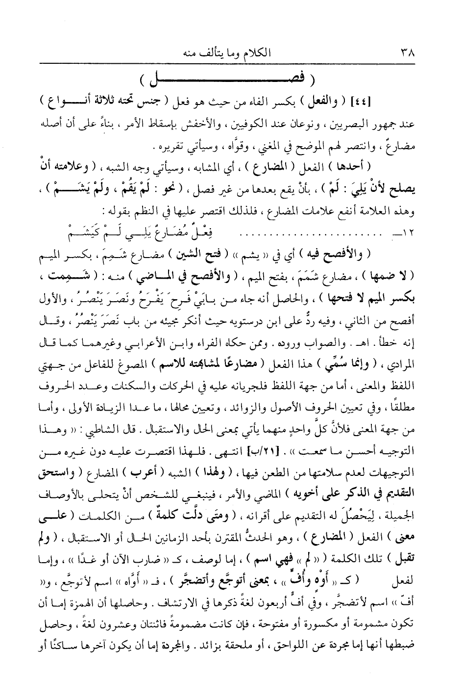 فلهذا اقتصرت عليه دون غيره من التوجيهات لعدم سلامتها من الطعن فيها، و"لهذا" الشبه "أعرب" المضارع "واستحق التقديم في الذكر على أخويه" الماضي والأمر، فينبغي للشخص أن يتحلى بالأوصاف الجميلة، ليحصل له التقديم على أقرانه، "ومتى دلت كلمة" من الكلمات "على معنى" الفعل "المضارع"، وهو الحدث المقترن بأحد الزمانين الحال والاستقبال، "ولم تقبل" تلك الكلمة ""لم" فهي اسم"، إما لوصف، كـ"ضارب الآن أو غدا"، وإما لفعل "كـ"أَوْهٍ وأُفّ"، بمعنى أتوجع وأتضجر"، فـ"أواه" اسم لأتوجع، و"أف" اسم لأتضجر، وفي أف أربعون لغة ذكرها في الارتشاف. وحاصلها أن الهمزة إما أن تكون مشمومة أو مكسورة أو مفتوحة، فإن كانت مضمومة فاثنتان وعشرون لغة، وحاصل ضبطها أنها إما مجردة عن اللواحق، أو ملحقة بزائد، والمجردة إما أن يكون آخرها ساكنا أو