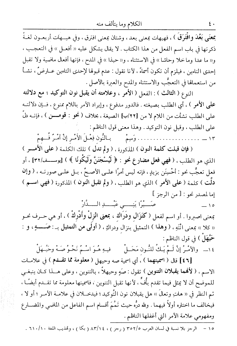 النوع "الثالث": الفعل "الأمر، وعلامته أن يقبل نون التوكيد؛ مع دلالته على الأمر"، أي: الطلب بصيغته. فالدور مدفوع، وإيراد الأمر باللام ممنوع، فإن دلالته على الطلب نشأت من اللام لا من الصيغة، بخلاف "نحو: قومن"، فإنه دل على الطلب، وقبل نون التوكيد. وهذا معنى قول الناظم: