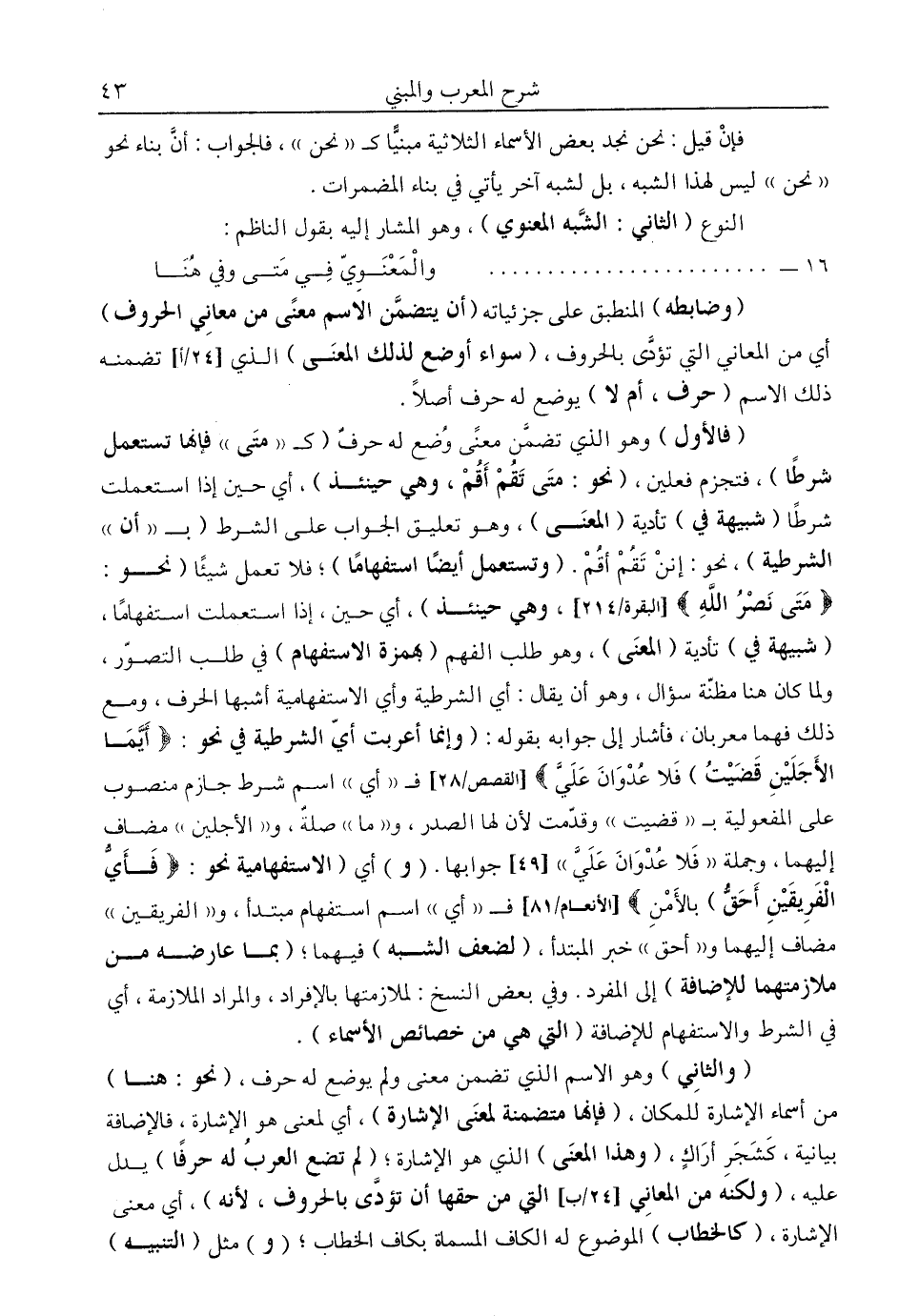 "فالأول" وهو الذي تضمن معنى وضع له حرف "كـ"متى" فإنها تستعمل شرطا"، فتجرم فعلين، "نحو: متى تقم أقم، وهي حينئذ"، أي: حين إذا استعملت شرطا "شبيهة في" تأدية "المعنى"، وهو تعليق الجواب على الشرط "بـ "أن" الشرطية"، نحو: إنن تقم أقم. "وتستعمل أيضا استفهاما"؛ فلا تعمل شيئا "نحو: {مَتَى نَصْرُ اللَّهِ} [البقرة: 214] ، هي حنيئذ"، أي: حين، إذا استعملت استفهاما، "شبيهة في" تأدية "المعنى"، وهو طلب الفهم "بهمزة الاستفهام" في طلب التصور، ولما كان هنا مظنة سؤال، وهو أن يقال: أي الشرطية وأي الاستفهامية أشبها الحرف، ومع ذلك فهما معربان، فأشار إلى جوابه بقوله: "وإنما أعربت أي الشرطية في نحو: {أَيَّمَا الْأَجَلَيْنِ قَضَيْتُ" فَلا عُدْوَانَ عَلَيَّ} [القصص: 28] فـ"أي" اسم شرط جازم منصوب على المفعولية بـ"قضيت" وقدمت لأن لها الصدر، و"ما" صلة، و"الأجلين" مضاف إليهما، وجملة "فلا عدوان علي" جوابها. "و" أي "الاستفهامية نحو: {فَأَيُّ الْفَرِيقَيْنِ أَحَقُّ" بِالْأَمْنِ} [الأنعام: 81] فـ"أي" اسم استفهام مبتدأ، و"الفريقين" مضاف إليهما و"أحق" خبر المبتدأ، "لضعف الشبه" فيهما؛ "بما عارضه من ملازمتهما للإضافة" إلى المفرد. وفي بعض النسخ: لملازمتها بالإفراد، والمراد الملازمة، أي: في الشرط والاستفهام للإضافة "التي هي من خصائص الأسماء".