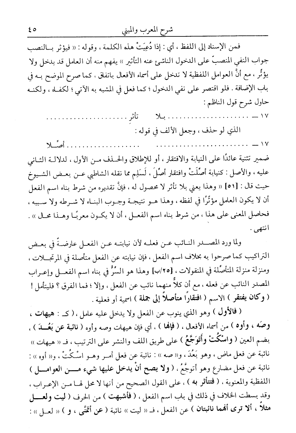 ضمير تثنية عائدا على النيابة والافتقار، أو للإطلاق والحذف من الأول، لدلالة الثاني عليه، والأصل: كنيابة أصلت وافتقار أصل، لسلم مما نقله الشاطبي عن بعض الشيوخ حيث قال: "وهذا يعني بلا تأثر لا محصول له، فإن تقديره من شرط بناء اسم الفعل أن لا يكون العامل مؤثرا في لفظه، وهذا هو نتيجة وجوب البناء لا شرطه ولا سببه، فحاصل المعنى على هذا، من شرط بناء اسم الفعل، أن لا يكون معربا وهذا محال". ا. هـ.