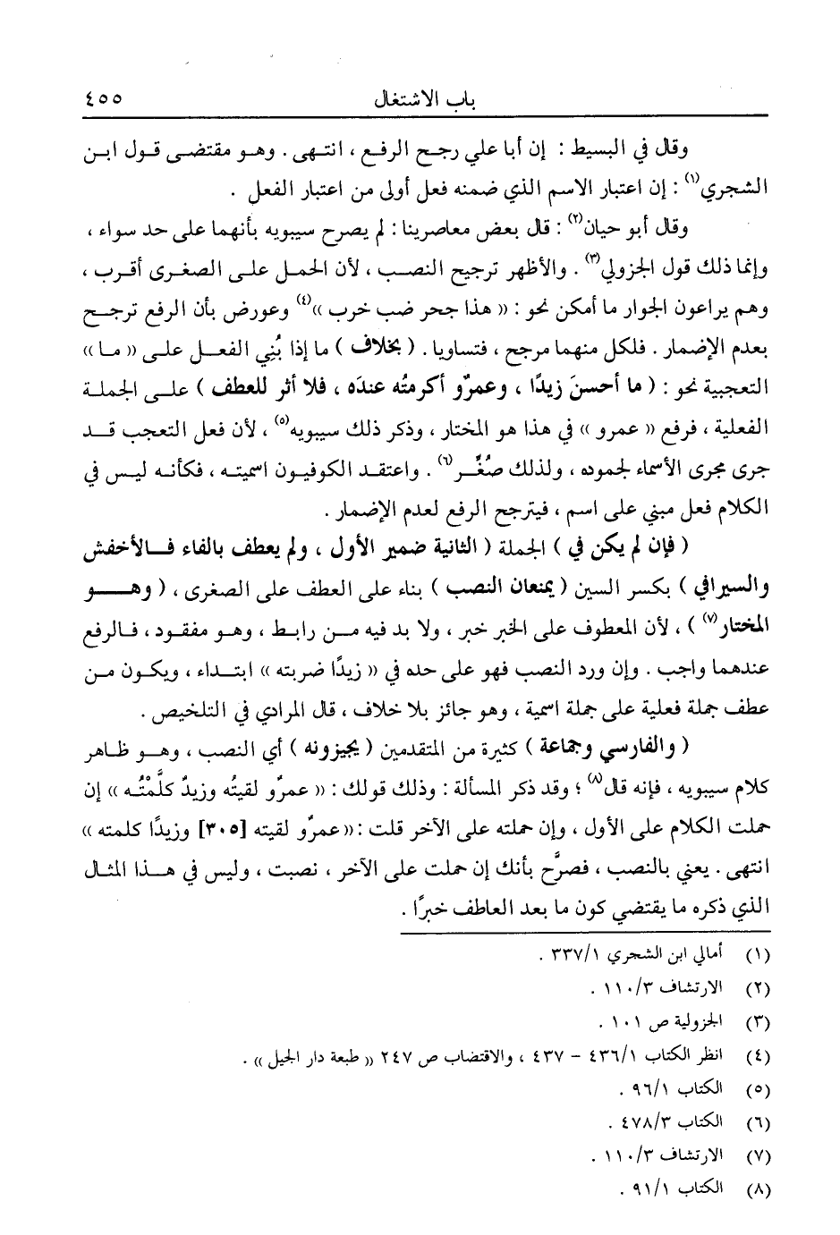 وقال في البسيط: إن أبا علي رجح افرفع، ا. هـ. وهو مقتضى قول ابن الشجري1: إن اعتبار الاسم الذي ضمنه فعل أولى من اعتبار الفعل.