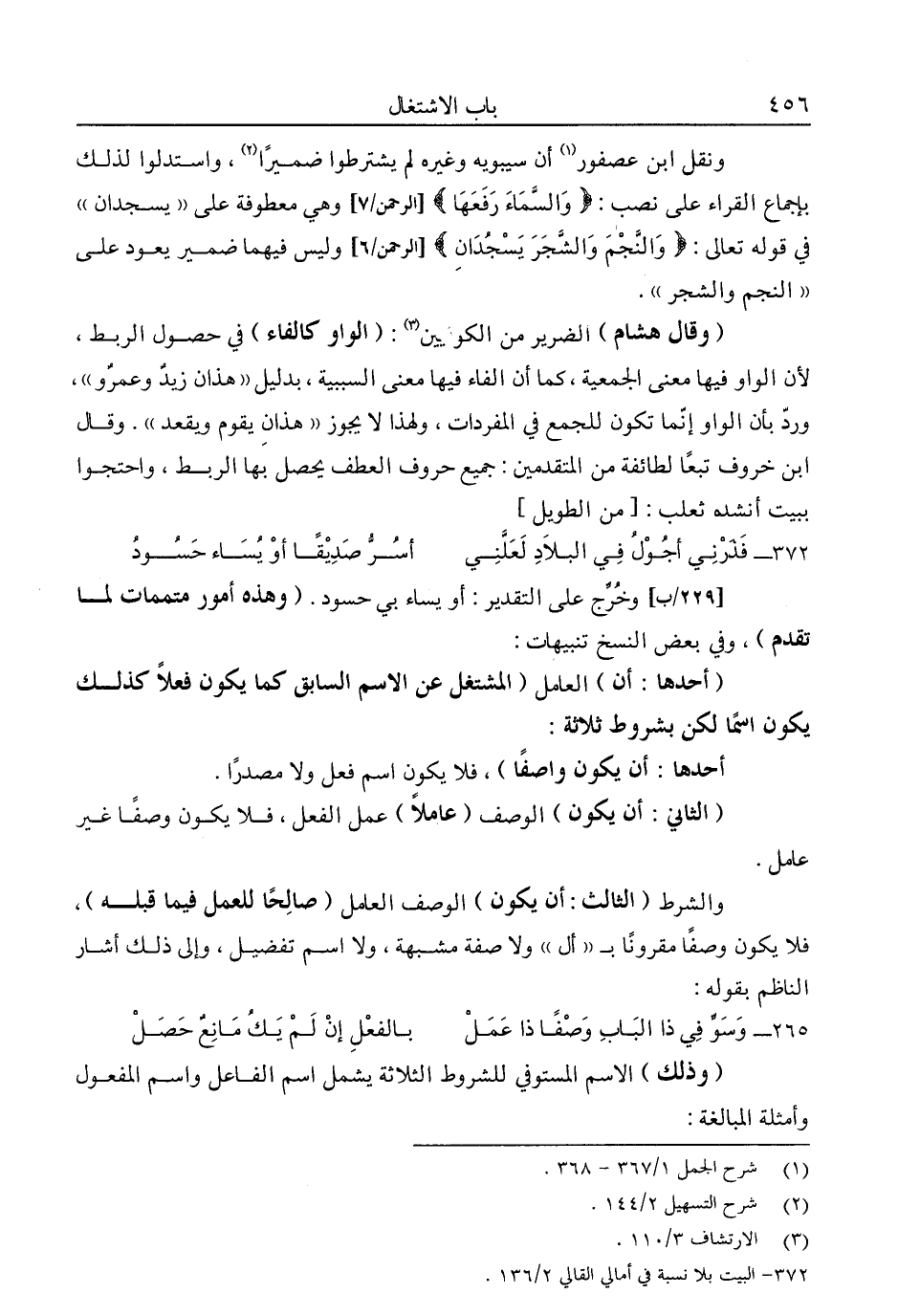 ونقل ابن عصفور1 إن سيبويه وغيره لم يشترطوا ضميرا2، واستدلوا لذلك بإجماع القراء على نصب: {وَالسَّمَاءَ رَفَعَهَا} [الرحمن: 7] وهي معطوفة على "يسجدان" في قوله تعالى: "وَالنَّجْمَ وَالشَّجَرَ يَسْجُدَانِ" [الرحمن: 6] وليس فيها ضمير يعود على "النجم والشجر".