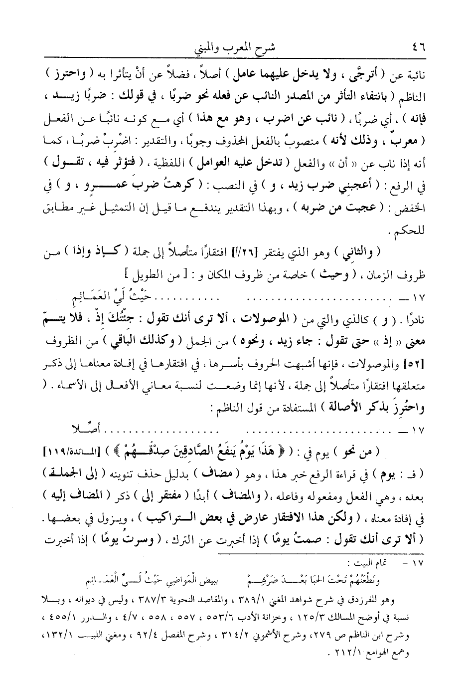"من نحو" يوم في: " {هَذَا يَوْمُ يَنْفَعُ الصَّادِقِينَ صِدْقُهُمْ} " [المائدة: 119] "فـ: يوم" في قراءة الرفع خبر هذا، وهو "مضاف" بدليل حذف تنوينه "إلى الجملة" بعده، وهي الفعل ومفعوله وفاعله، "والمضاف" أبدا "مفتقر إلى" ذكر "المضاف إليه" في إفادة معناه، " ولكن هذا الافتقار عارض في بعض التراكيب"، ويزول في بعضها. "ألا ترى أنك تقول: صمت يوما" إذا أخبرت عن الترك، "وسرت يوما" إذا أخبرت