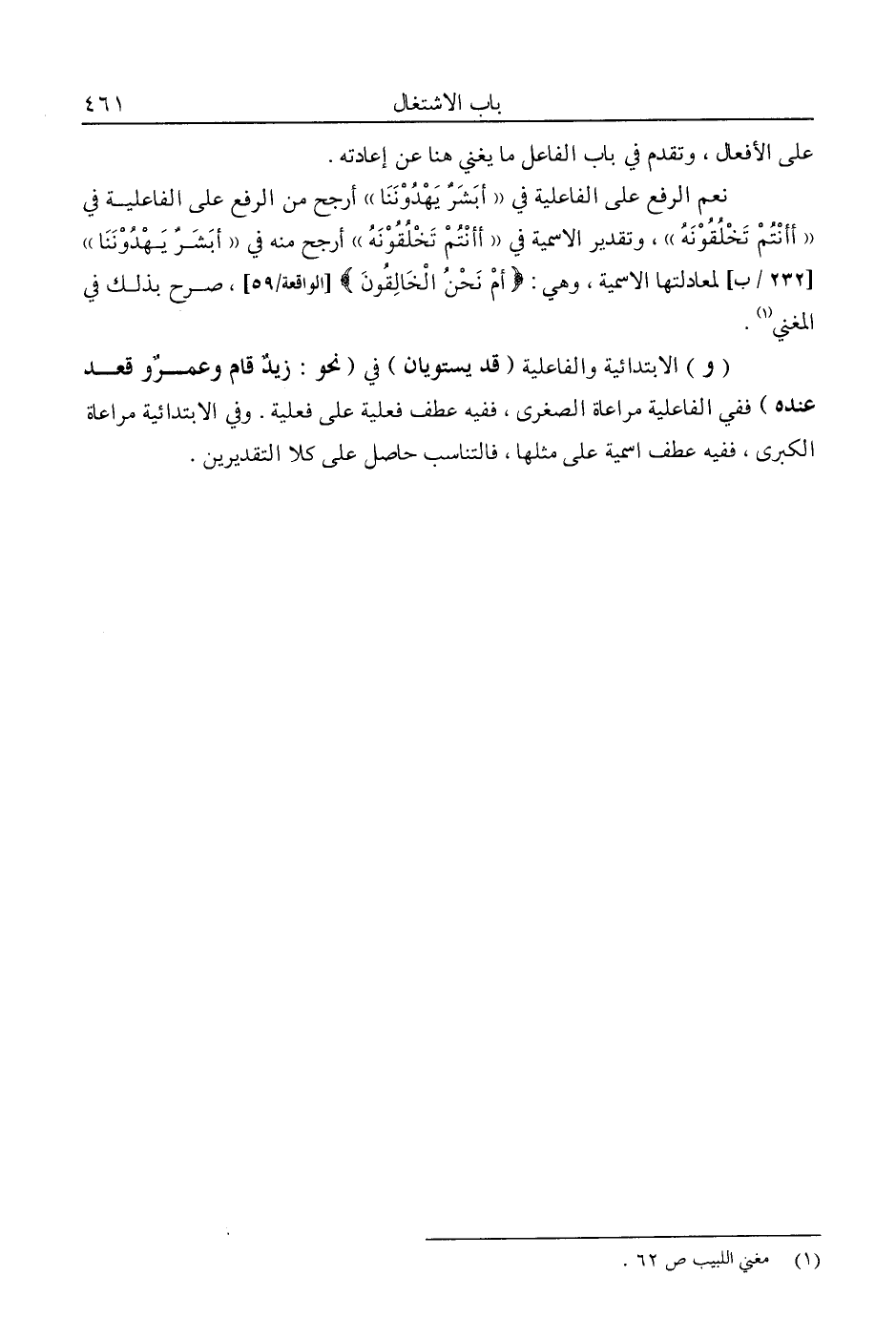 نعم الرفع على الفاعلية في "أبشر يهدوننا" أرجح في الرفع على الفاعلية في "أأنتم تخلقونه" وتقدير الاسمية في "أأنتم تخلقونه" أرجح منه في "أبشر يهدوننا" لمعادلتها الاسمية، وهي: {أَمْ نَحْنُ الْخَالِقُونَ} [الواقعة: 59] صرح بذلك في المغني1.