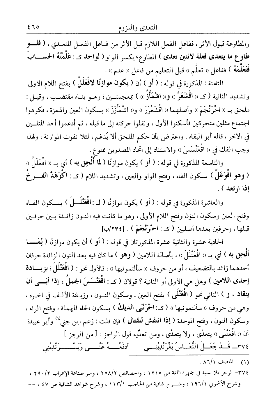 الثامنة: المذكورة في قوله: "أو" أن "يكون موازنا للافْعَلَلّ" بفتح اللام الأولى وتشديد الثانية "كـ: "اقشعر" و"اشمأز" بمعجمتين؛ وهو بناء مقتضب، وقيل: ملحق بـ"احرنجم" وأصلهما "اقشعرر" و"اشمأزز" بسكون العين والهمزة، فكرهوا اجتماع مثلين متحركين فأسكنوا الأول، ونقلوا حركته إلى ما قبله، ثم أدغموا أحد المثلين في الآخر، قاله أبو البقاء. واعترض بأن حكم الملحق ألا يدغم، لئلا تفوت الموازنة، ولهذا وجب الفك في "اقعنسس" والاستناد إلى اتحاد المصدرين ممنوع.