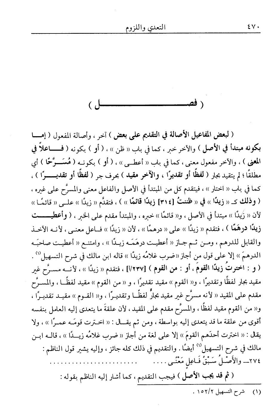 "لبعض المفاعيل الأصالية في التقديم على بعض" آخر، وأصالة المفعول "إما بكونه مبتدأ في الأصل" والآخر خبر, كما في باب "ظن", "أو" بكونه "فاعلا في المعنى", والآخر مفعول معنى، كما في باب "أعطى"، "أو" بكونه "مسرحًا" أي: مطلقًا، لم يتقيد بجار "لفظًا أو تقديرًا، والآخر مقيد" بحرف جر "لفظًا أو تقديرًا"، كما في باب "اختار" فيتقدم كل من المبتدأ في الأصل والفاعل معنى والمسرح على غيره، و"ذلك كـ: "زيدًا" في "ظننت زيدًا قائمًا""، فتقدم "زيدًا" على "قائمًا" لأن "زيدًا" مبتدأ في الأصل، و"قائمًا" خبره، والمبتدأ مقدم على الخبر، "وأعطيت زيدًا درهمًا" فتقدم "زيدًا" على "درهما"؛ لأن "زيدًا" فاعل معنى؛ لأنه الآخذ والقابل للدرهم، ومن ثم جاز "أعطيت درهمه زيدًا"، فاعل معنى؛ لأنه الآخذ والقابل للدرهم، ومن ثم جاز "أعطيت درهمه زيدًا"، وامتنع "أعطيت صاحبه الدرهم" إلا على قول من أجاز "ضرب غلامه زيدًا" قاله ابن مالك في شرح التسهيل1.