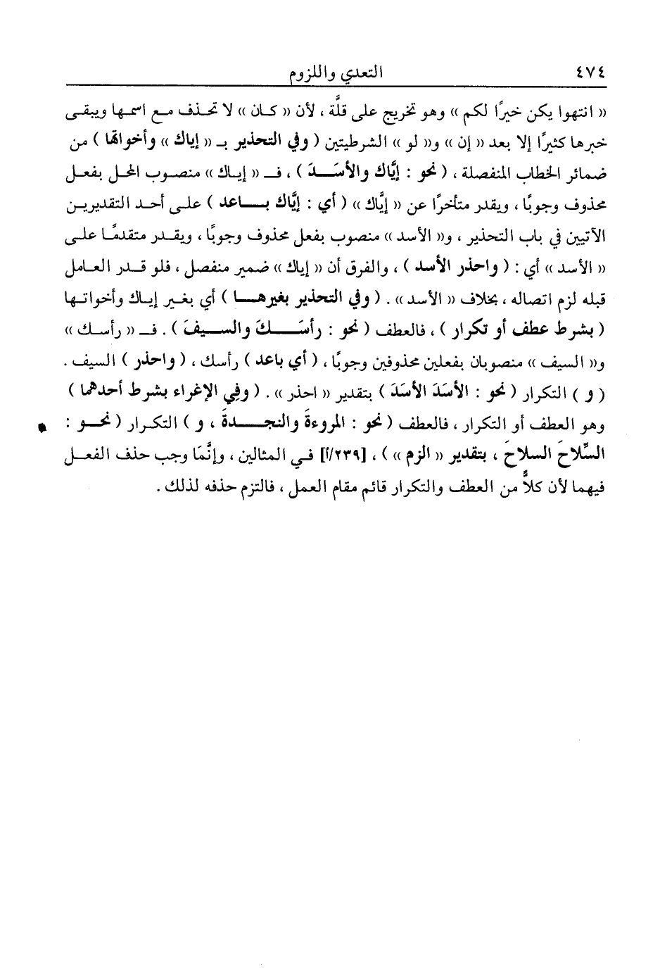 "انتهوا يكن خيرًا لكم" وهو تخريج على قلة؛ لأن "كان" لا تحذف مع اسمها ويبقى خبرها كثيرًا إلا بعد "إن" و"لو" الشرطيتين "وفي التحذير بـ"إياك" وأخواتها" من ضمائر الخطاب المنفصلة، "نحو: إياك والأسد"، فـ"إياك" منصوب المحل بفعل محذوف وجوبًا، ويقدر متأخرًا عن "إياك" "أي: "إياك باعد" على أحد التقديرين الآتيين في باب التحذير، و"الأسد" منصوب بفعل محذوف وجوبًا، ويقدر متقدمًا على "الأسد" أي: "واحذر الأسد، والفرق أن "إياك" ضمير منفصل، فلو قدر العامل قبله لزم اتصاله، بخلاف "الأسد"، "وفي التحذير بغيرها" أي: بغير إياك وأخواتها "بشر عطف أو تكرار"، فالعطف "نحو: رأسك والسيف". فـ"رأسك" و"السيف" منصوبان بفعلين محذوفين وجوبًا، "أي: باعد" رأسك"، "واحذر" السيف.