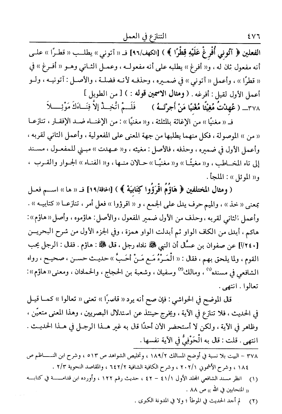 "ومثال المختلفين {هَاؤُمُ اقْرَءُوا كِتَابِيَهْ} [الحاقة: 109] فـ"ها" اسم فعل بمعنى "خذ" والميم حرف يدل على الجمع، و"اقرءوا" فعل أمر، تنازعا "كتابيه". وأعمل الثاني لقربه، وحذف من الأول ضمير المفعول، والأصل: هاؤموه، وأصل "هاؤم": هاكم، أبدل من الكاف الواو ثم أبدلت الواو همزة، وفي الجزاء الأول من شرح البحرين عن صفوان بن عسال أن النبي صلى الله عليه وسلم ناداه رجل، قال صلى الله عليه وسلم: "هاؤم". فقال: الرجل يحب القوم، ولما يلحق بهم، فقال: "المرء مع من أحب" حديث حسن، صحيح، رواه الشافعي في مسنده1، ومالك2, وسفيان، وشعبة بن الحجاج، والحمادان، ومعنى "هاؤم": تعالوا. ا. هـ.