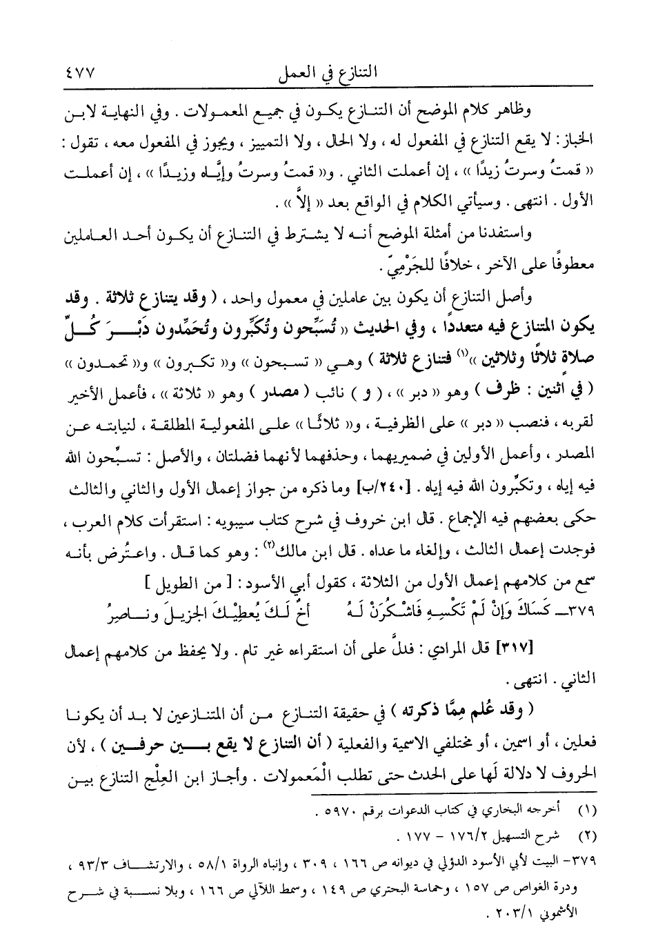 وأصل التنازع أن يكون بين عاملين في معمول واحد، "وقد يتنازع ثلاثة. وقد يكون المتنازع فيه متعددًا، وفي الحديث "تسبحون وتكبرون وتحمدون دبر كل صلاة ثلاثًا وثلاثين" 1 فتنازع ثلاثة" وهي "تسبحون" و"تكبرون" و"تحمدون" "في اثنين: ظرف" وهو "دبر"، "و" نائب "مصدر" وهو "ثلاثة"، فأعمل الأخير لقربه، فنصب "دبر" على الظرفية، و"ثلاثًا" على المفعولية المطلقة، لنيابته عن المصدر، وأعمل الأولين في ضميريهما، وحذفهما لأنهما فضلتان، والأصل: تسبحون الله فيه إياه، وتكبرون الله فيه إياه، وما ذكره من جواز إعمال الأول والثاني والثالث حكى بعضهم فيه الإجماع، قال ابن خروف في شرح كتاب سيبويه: استقرأت كلام العرب، فوجدت إعمال الثالث، وإلغاء ما عداه. قال ابن مالك2: وهو كما قال. واعترض بأنه سمع من كلامهم إعمال الأول من الثلاثة، كقول أبي الأسود: [من الطويل]