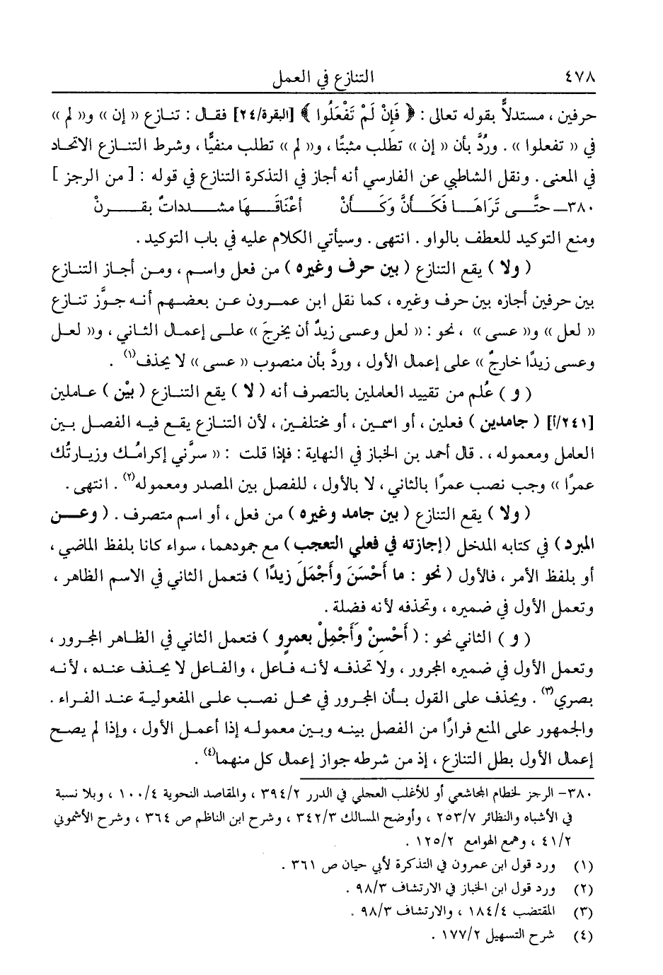 حرفين، مستدلا بقوله تعالى: {فَإِنْ لَمْ تَفْعَلُوا} [البقرة: 24] فقال: تنازع "إن" و"لم" في "تفعلوا". ورد بأن "إن" تطلبن مثبتًا، و"لم" تطلب منفيا، وشرط التنازع الاتحاد في المعنى، ونقل الشاطبي عن الفارسي أنه أجاز في التذكرة التنازع في قوله: [من الرجز]