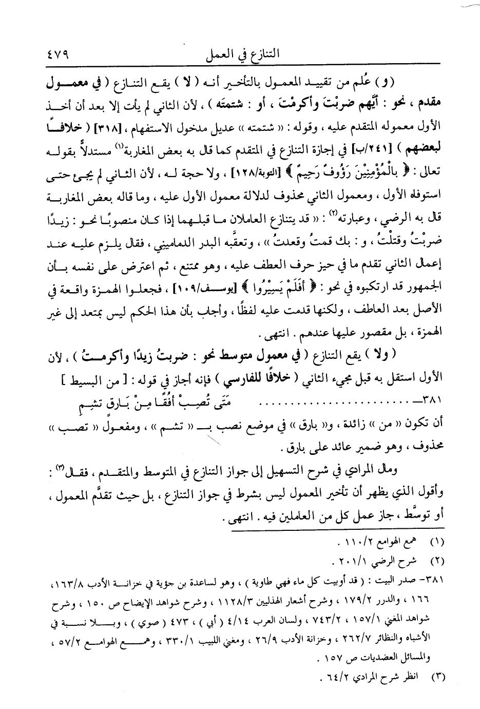ومال المرادي في شرح التسهيل إلى جواز التنازع في المتوسط والمتقدم، فقال3: وأقول الذي يظهر أن تأخير المعمول ليس بشرط في التنازع، بل حيث تقدم المعمول، أو توسط