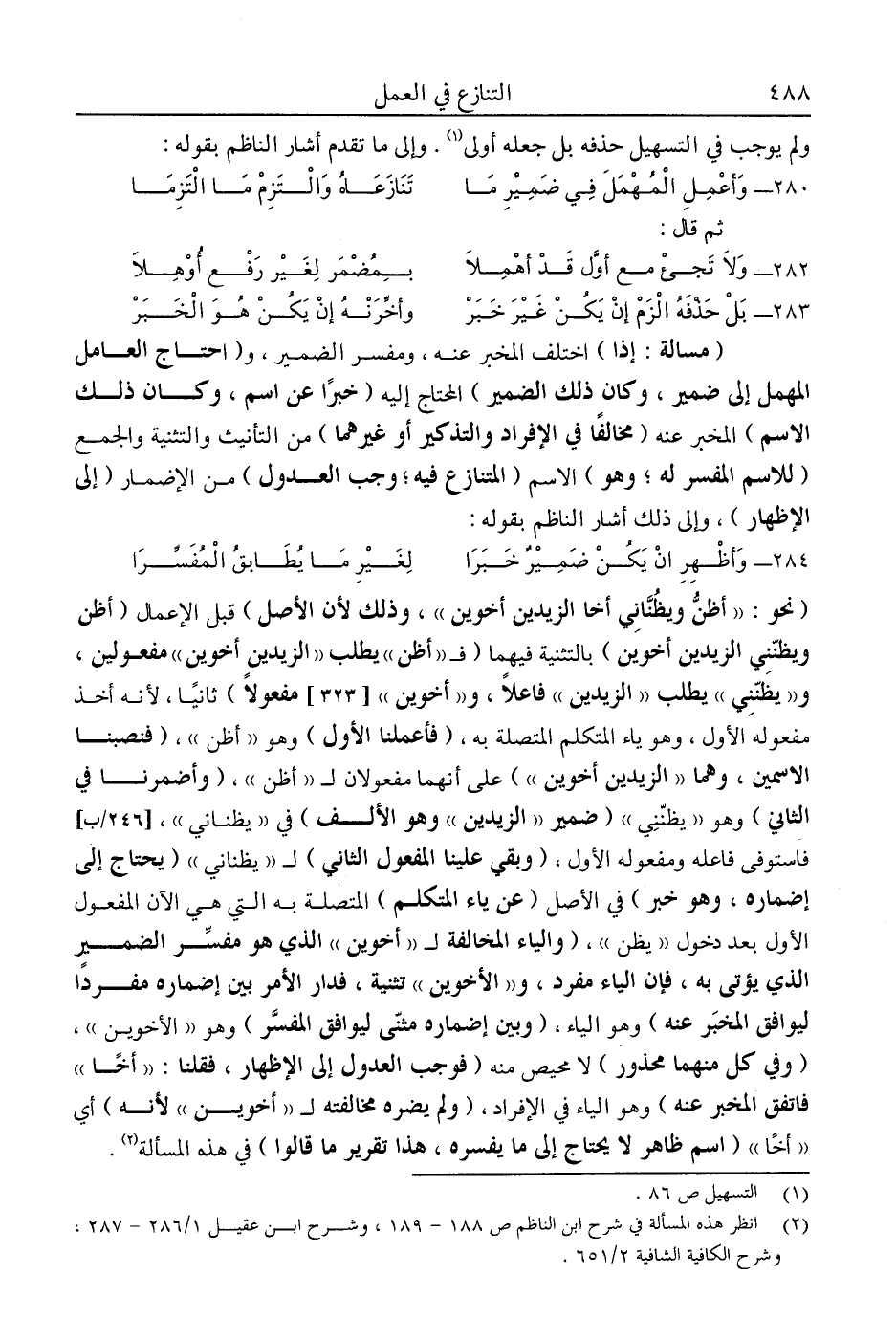 2 انظر هذه المسألة في شرح ابن الناظم ص188-189، وشرح ابن عقيل 1/ 386, 287، وشرح الكافية الشافية 2/ 651.