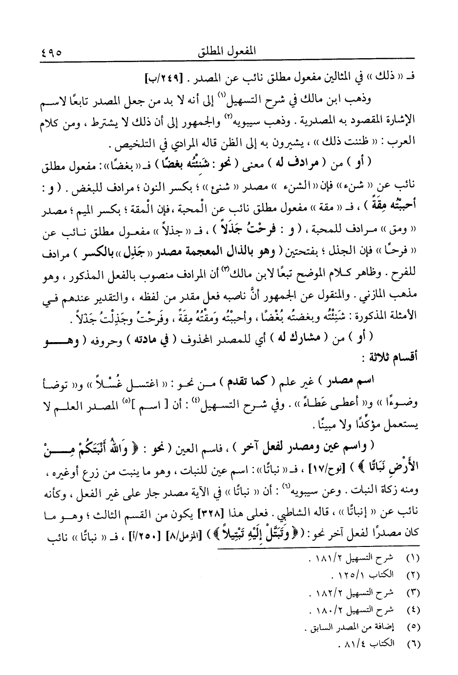 "واسم عين ومصدر لفعل آخر"، فاسم العين "نحو: {وَاللَّهُ أَنْبَتَكُمْ مِنَ الْأَرْضِ نَبَاتًا} " [نوح: 17] فـ"نباتا": اسم عين للنبات، وهو ما ينبت من زرع أو غيره، ومنه زكاة النبات، وعن سيبويه6: أان "نباتًا" في الآية مصدر جار على غير الفعل، وكأنه نائب عن "إنباتًا"، قاله الشاطبي، فعلى هذا "يكون من القسم الثالث؛ وهو ما كان مصدرًا لفعل آخر نحو: {وَتَبَتَّلْ إِلَيْهِ تَبْتِيلًا} [المزمل: 8] فـ"نباتًا" نائب