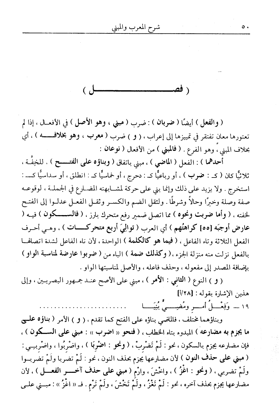 "والفعل" أيضا "ضربان": ضرب "مبني، وهو الأصل" في الأفعال، إذا لم تعتورها معان تفتقر في تمييزها إلى إعراب، "و" ضرب "معرب، وهو بخلافه"، أي: بخلاف المبني، وهو الفرع. "فالمبني" من الأفعال "نوعان:
