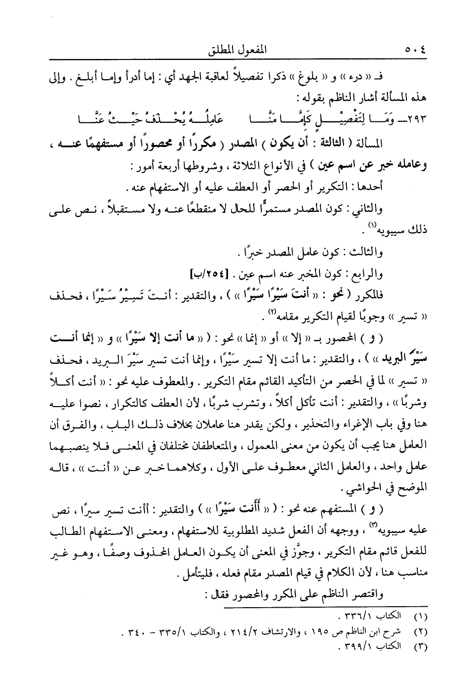 "و" المحصور بـ"إلا" أو "إنما" نحو: ""ما أنت إلا سيرًا"، و "إنما أنت سير البريد""، والتقدير: ما أنت إلا تسير سيرًا, وإنما أنت تسير سير البريد، فحذف "تسير" لما في الحصر من التأكيد القائم مقام التكرير. والمعطوف عليه نحو: "أنت أكلا وشربًا"، والتقدير: أنت تأكل أكلًا، وتشرب شربًا؛ لأن العطف كالتكرار، نصوا عليه هنا وفي باب الإغراء والتحذير، ولكن يقدر هنا عاملان بخلاف ذلك الباب، والفرق أن العامل هنا يجب أن يكون من معنى المعمول, والمتعاطفان مختلفان في المعنى فلا ينصبهما عامل واحد، والعامل الثاني معطوف على الأول، وكلاهما خبر عن "أنت"، قاله الموضح في الحواشي.