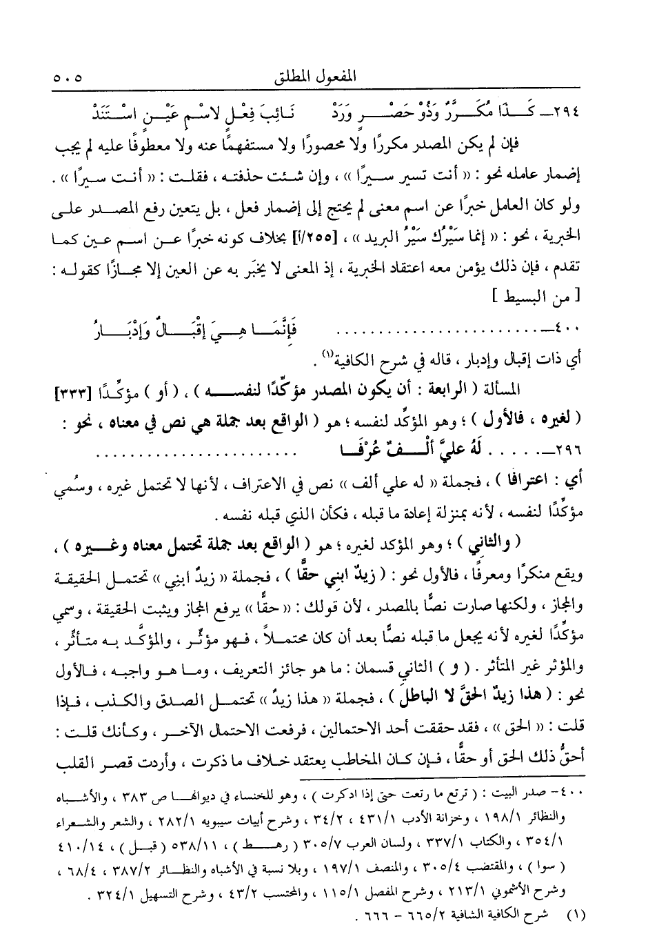 المسألة "الرابعة: أن يكون المصدر مؤكدًا لنفسه"، "أو" مؤكدا "لغيره، فالأول"؛ وهو المؤكد لنفسه، هو "الواقع" بعد جملة هي نص في معناه، نحو: