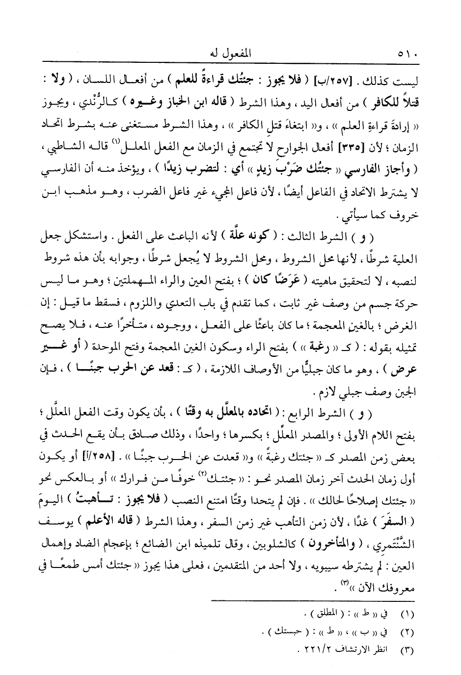 ليست كذلك. "فلا يجوز: جئتك قراءة للعلم" من أفعال اللسان، "ولا: قتلًا للكافر" من أفعال اليد، وهذا الشرط "قاله ابن الخباز وغيره" كالرندي، ويجوز "إرادة قراءة العلم"، و"ابتغاء قتل الكافر"، وهذا الشرط مستغنى عنه بشرط اتحاد الزمان؛ لأن أفعال الجوارح لا تجتمع في الزمان مع الفعل المعلل1 قاله الشاطبي، "وأجاز الفارسي "جئتك ضرب زيد" أي: لتضرب زيدًا"، ويؤخذ منه أن الفارسي لا يشترط الاتحاد في الفاعل أيضًا؛ لأن فاعل المجيء غير فاعل الضرب، وهو مذهب ابن خروف كما سيأتي.