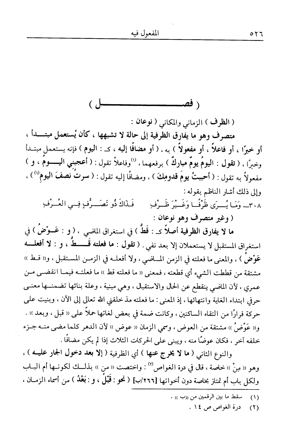 متصرف وهو ما يفارق الظرفية إلى حالة لا تشبهها، كأن يستعمل مبتدأ، أو خبرًا، أو فاعلًا، أو مفعولًا" به، "أو مضافًا إليه، كـ: اليوم" فإنه يستعمل مبتدأ وخبرًا، "تقول: اليوم يوم مبارك" برفعهما1، وفاعلا تقول: "أعجبني اليوم، و" مفعولًا، به تقول: "أحببت يوم قدومك"، ومضافًا إليه تقول: "سرت نصف اليوم1" وإلى ذلك أشار الناظم بقوله: