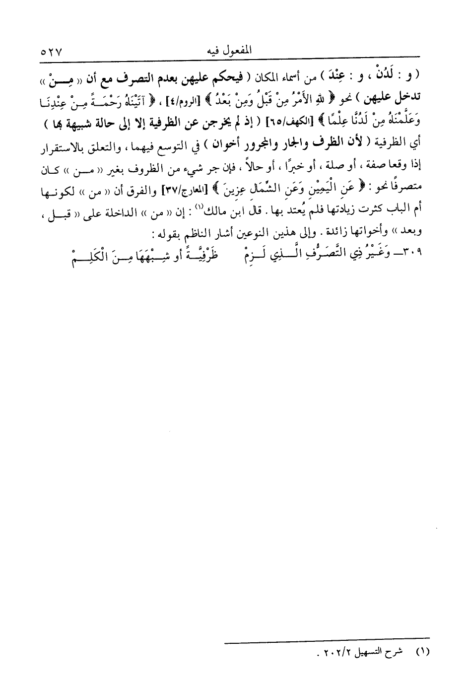 "و: لدن، و: عند" من أسماء المكان " فيحكم عليهن بعدم التصرف مع أن "من" تدخل عليهن" نحو: {لِلَّهِ الْأَمْرُ مِنْ قَبْلُ وَمِنْ بَعْدُ} [الروم: 4] ، {آتَيْنَاهُ رَحْمَةً مِنْ عِنْدِنَا وَعَلَّمْنَاهُ مِنْ لَدُنَّا عِلْمًا} [الكهف: 65] "إذ لم يخرجن عن الظرفية إلا إلى حالة شبيهة بها" أي: الظرفية "لأن الظرف والجار والمجرور أخوان" في التوسع فيهما، والتعلق بالاستقرار إذا وقعا صفة، أو صلة، أو خبرًا، أو حالًا، فإن جر شيء من الظروف بغير "من" كان متصرفًا نحو: {عَنِ الْيَمِينِ وَعَنِ الشِّمَالِ عِزِينَ} [المعارج: 37] والفرق أن "من" لكونها أم الباب كثرت زيادتها فلم يعتد بها. قال ابن مالك1: إن "من" الداخلة على "قبل، وبعد" وأخواتها زائدة. وإلى هذين النوعين أشار الناظم بقوله: