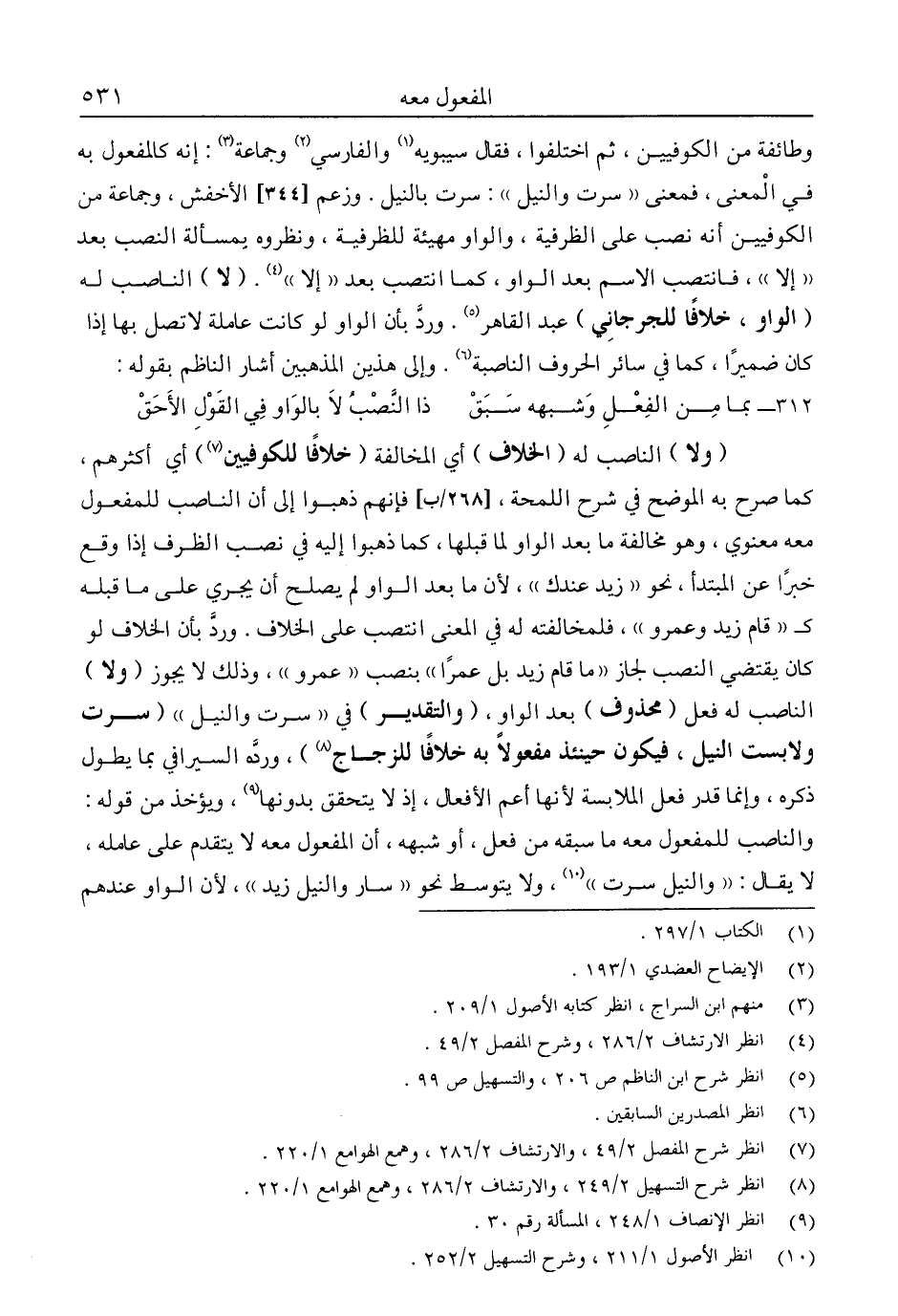 وطائفة من الكوفيين، ثم اختلفوا فقال سيبويه1 والفارسي2 وجماعة 3: إنه كالمفعول به في المعنى، فمعنى "سرت والنيل": سرت بالنيل. وزعم الأخفش، وجماعة من الكوفيين أنه نصب على الظرفية، والواو مهيئة للظرفية، ونظروه بمسألة النصب بعد "إلا" فانتصب الاسم بعد الواو، كما انتصب بعد "إلا"4. "لا" النصاب له "الواو، خلافًا للجرجاني" عبد القاهر5، ورد بأن الواو لو كانت عاملة لاتصل بها إذا كان ضميرًا، كما في سائر الحروف الناصبة6. وإلى هذين المذهبين أشار الناظم بقوله: