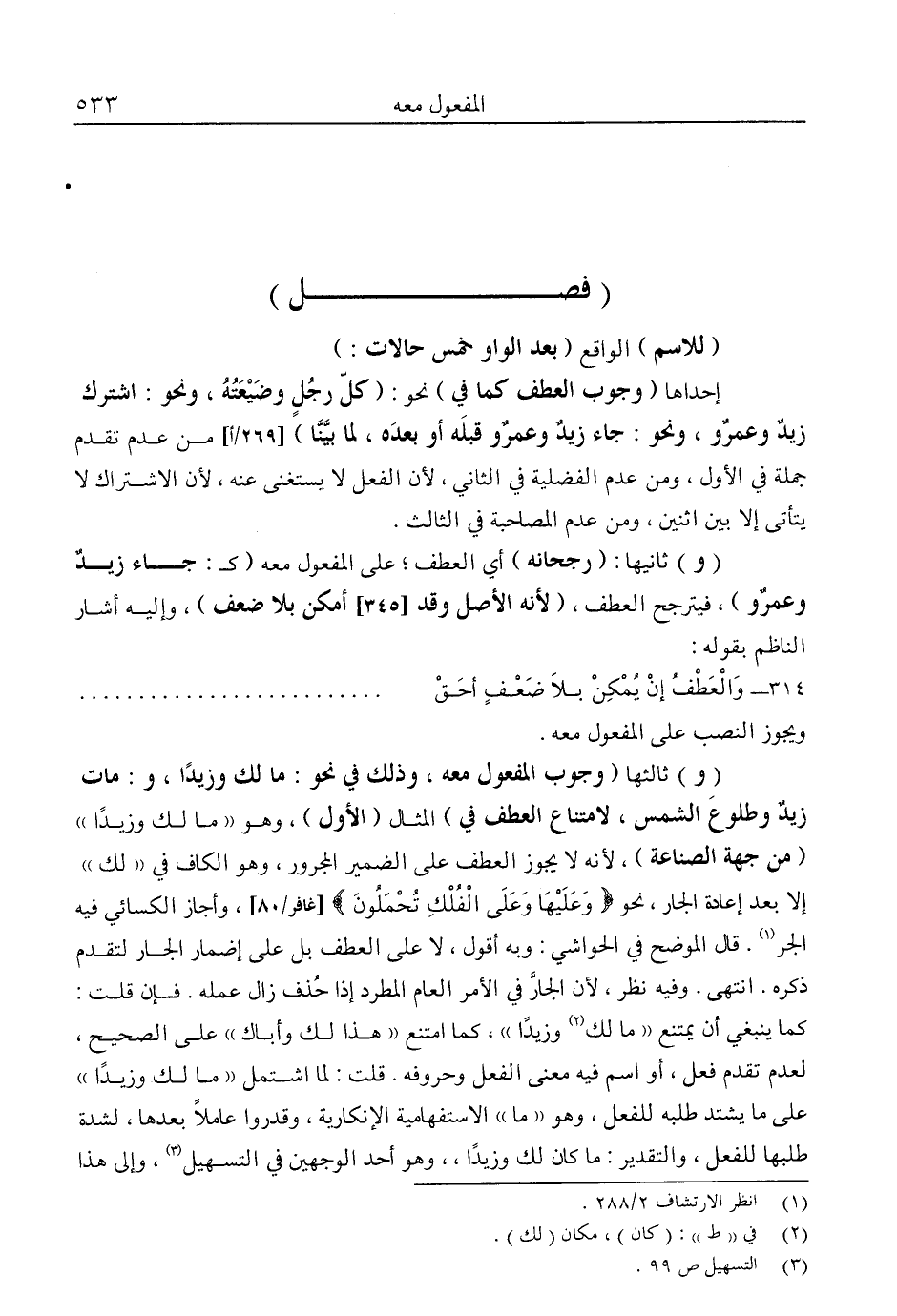 "و" ثالثها: "وجوب المفعول معه، وذلك في نحو: ما لك وزيدًا, و: مات زيد وطلوع الشمس، لامتناع العطف في" المثال "الأول"، وهو "ما لك وزيدًا" "من جهة الصناعة"؛ لأنه لا يجوز العطف على الضمير المجرور، وهو الكاف في "لك" إلا بعد إعادة الجار، نحو: {وَعَلَيْهَا وَعَلَى الْفُلْكِ تُحْمَلُونَ} [غافر: 80] وأجاز الكسائي فيه الجر1. قال الموضح في الحواشي: وبه أقول، لا على العطف بل على إضمار الجار لتقدم ذكره. ا. هـ. وفيه نظر؛ لأن الجار في الأمر العام المطرد إذا حذف زال عمله. فإن قلت: