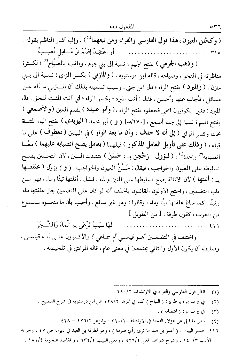 "وذهب الجرمي" بفتح الجيم، نسبة إلى بني جزم، ويلقب بالصياح2؛ لكثرة مناظرته في النحو، وصياحه، قاله ابن درستويه. "والمازني" بكسر الزاي؛ نسبة إلى بني مازن "والمبرد" بفتح الراء، قال ابن جني: وسبب تسميته بذلك أن المازني سأله عن مسائل. فأجاب عنها وأحسن، فقال: أنت المبرد؛ بكسر الراء؛ أي: أنت المثبت للحق. قال المبرد: فغير الكوفيون اسمي فجعلوه بفتح الراء، "وأبو عبيدة" بضم العين "والأصمعي" بفتح الميم؛ نسبة إلى جده أصمع، "و" أبو محمد "اليزيدي" بفتح الياء المثناة تحت وكسر الزاي "إلى أنه لا حذف، وأن ما بعد الواو" في البيتين "معطوف" على ما قبله "وذلك على تأويل العامل المذكور" قبلهما "بعامل يصح انصبابه عليهما" معًا انصبابة3 واحدة4، "فيؤول: زججن بـ: حسن" بتشديد السين؛ لأن التحسين يصح تسليطه على العيون والحواجب، فيقال: حسن العيون والحواجب. "و" يؤول "علفتها بـ: أنلتها" لأن الإنالة يصح تسليطها على التبن والماء، فيقال: أنلتها تبنًا وماء, فهو من باب التضمين واحتج الأولون القائلون بالحذف أنه لو كان التضمين لجاز علفتها ماء وتبنًا، كما ساغ علفتها تبنًا وماء، وقالوا: وهو غير سائغ. وأجيب بأن ما منعوه مسموع من العرب، كقول طرفة: [من الطويل]