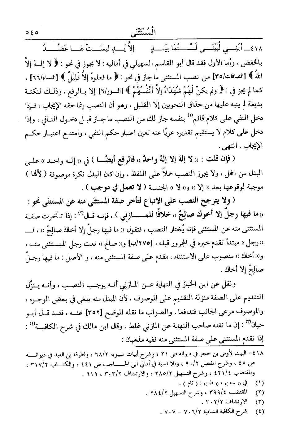 بالخفض, وأما الأول فقد قال أبو القاسم السهيلي في أماليه. لا يجوز في نحو: {لَا إِلَهَ إِلَّا اللَّهُ} [الصافات: 35] من نصب المستثنى ما جاز في نحو: {مَا فَعَلُوهُ إِلَّا قَلِيلٌ} [النساء: 66] ، كما لم يجز في: {وَلَمْ يَكُنْ لَهُمْ شُهَدَاءُ إِلَّا أَنْفُسُهُمْ} [النور: 6] إلا بالرفع، وذلك لنكتة بديعة لم ينبه عليها من حذاق النحويين إلا القليل, وهو أن النصب إنما حقه الإيجاب، فإذا دخل النفي على كلام قائم1، بنفسه جاز لك من النصب ما جاز قبل دخول النافي، وإذا دخل على كلام لا يستقيم تقديره عريا عنه تعين اعتبار حكم النفي، وامتنع اعتبار حكم الإيجاب. ا. هـ.