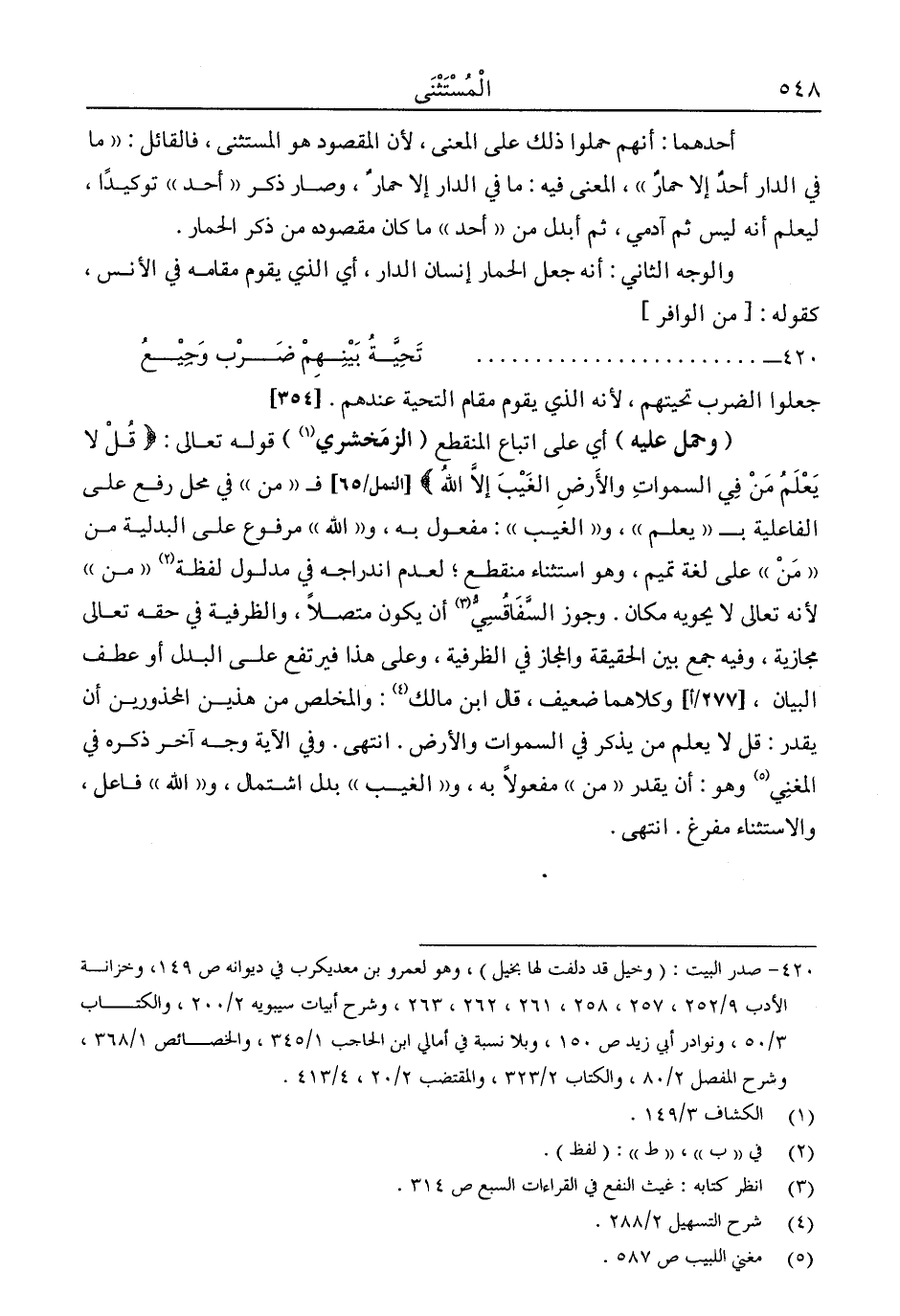 "وحمل عليه" أي: على اتباع المنقطع "الزمخشري1" قوله تعالى: {قُلْ لا يَعْلَمُ مَنْ فِي السَّمَاوَاتِ وَالأَرْضِ الْغَيْبَ إِلاّ اللَّهُ} [النمل: 65] فـ"من" في محل رفع على الفاعلية بـ"يعلم"، و"الغيب": مفعول به، و"الله" مرفوع على البدلية من "من" على لغة تميم، وهو استثناء منقطع؛ لعدم اندراجه في مدلول لفظه2 "من" لأنه تعالى لا يحويه مكان. وجوز السفاقسي3 أن يكون متصلًا، والظرفية في حقه تعالى مجازية، وفيه جمع بين الحقيقة والمجاز في الظرفية، وعلى هذا فيرتفع على البدل أو عطف البيان. وكلاهما ضعيف، قال ابن مالك4: والمخلص من هذين المحذورين أن يقدر: قل لا يعمل من يذكر في السموات والأرض. ا. هـ. وفي الآية وجه آخر ذكره في المغني5 وهو: أن يقدر "من" مفعولًا به، و"الغيب" بدل اشتمال، و"الله" فاعل، والاستثناء مفرغ. ا. هـ.