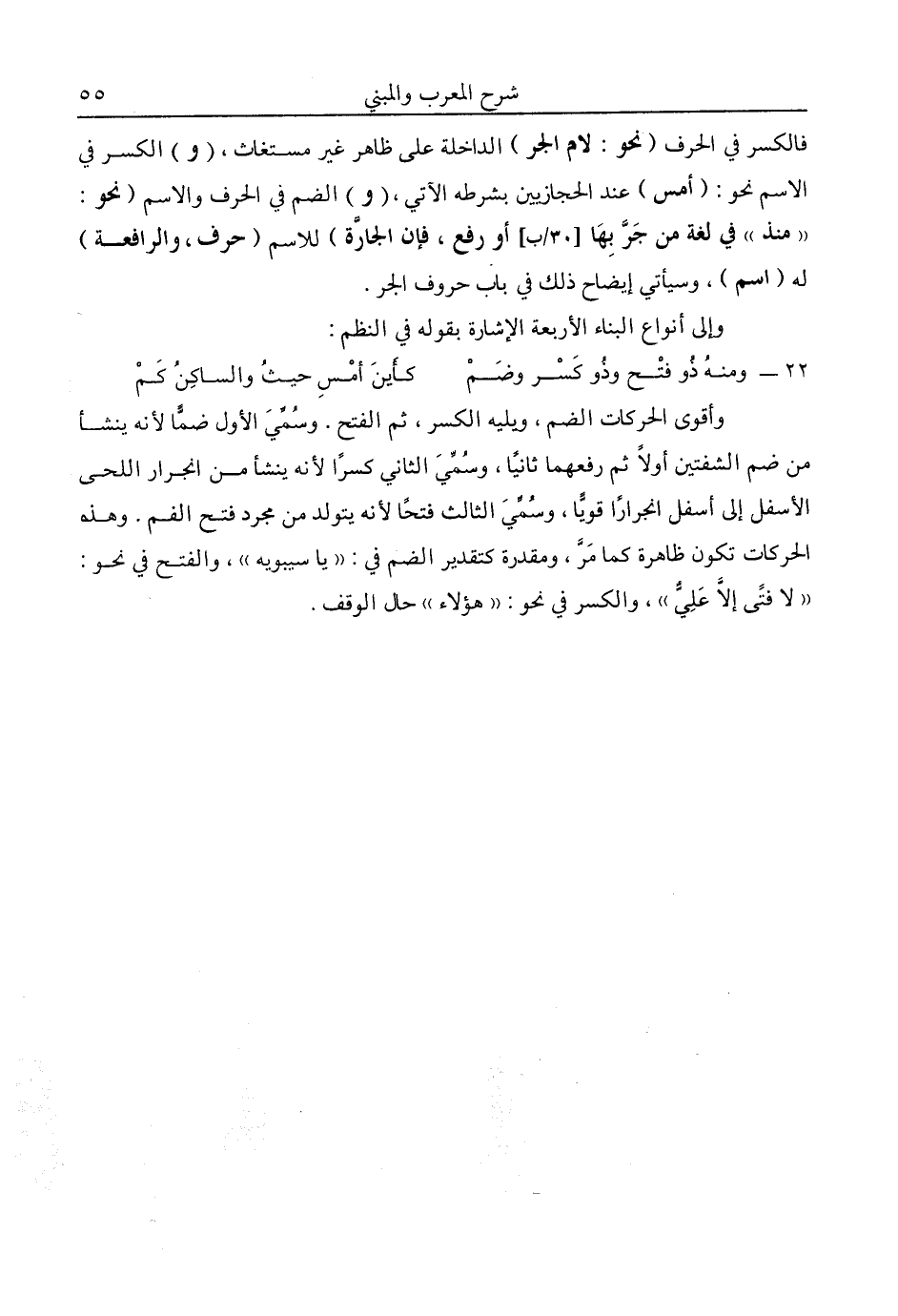 فالكسر في الحرف "نحو: لام الجر" الداخلة على ظاهر غير مستغاث، "و" الكسر في الاسم نحو: "أمس" عند الحجازيين بشرطه الآتي، "و" الضم في الحرف والاسم "نحو: "منذ" في لغة من جر بها أو رفع، فإن الجارة" للاسم "حرف، والرافعة" له "اسم"، وسيأتي إيضاح ذلك في باب حروف الجر.