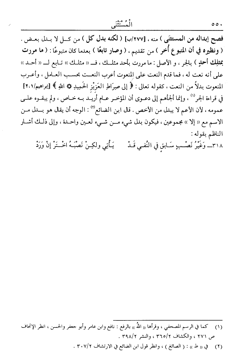 "ونظيره في أن المتبوع أخر" من تقديم، "وصار تابعًا" بعدما كان متبوعًا: "ما مررت بمثلك أحد" بالجر، والأصل: ما مررت بأحد مثلك، فـ"مثلك" تابع لـ"أحد" على أنه نعت له، فما قدم النعت على المنعوت أعرب النعت بحسب العامل، وأعرب المنعوت بدلًا من النعت، كقوله تعالى: {إِلَى صِرَاطِ الْعَزِيزِ الْحَمِيدِ، اللَّهِ} [إبراهيم: 1، 2] في قراءة الجر1، وإنما ألجأهم إلى دعوى أن المؤخر عام أريد به خاص، ولم يبقوه على عمومه؛ لأن الأعم لا يبدل من الأخص. قال ابن الضائع2: الوجه أن يقال هو بدل من الاسم مع "إلا" مجموعين، فيكون بدل شيء من شيء لعين واحدة، وإلى ذلك أشار الناظم بقوله: