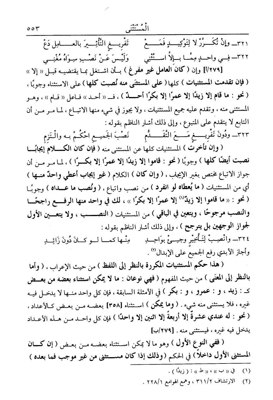 "هذا حكم المستثنيات المكررة بالنظر إلى اللفظ" من حيث الإعراب. "وأما بالنظر إلى المعنى" من حيث المفهوم "فهي نوعان: ما لا يمكن استثناء بعضه من بعض كـ: زيد، و: عمرو، و: بكر" في الأمثلة السابقة، فإن كل واحد منها لا يدخل فيه غيره، فلا يستثنى منه شيء، "وما يمكن" استثناء بعضه من بعض كالأعداد، "نحو: له عندي عشرة إلا أربعة إلا اثنين إلا واحدًا" فإن كل واحد من هذه الأعداد يدخل فيه غيره، فيستثنى منه.