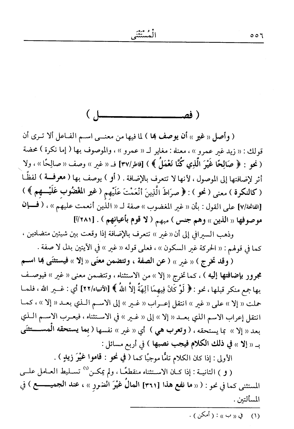 "وأصل "غير" أن يوصف بها" لما فيها من معنى اسم الفاعل ألا ترى أن قولك: "زيد غير عمرو"، معناه: "مغاير لـ"عمرو"، والموصوف بها "إما نكرة" محضة "نحو: {صَالِحًا غَيْرَ الَّذِي كُنَّا نَعْمَلُ} " [فاطر: 37] فـ"غير" وصف "صالحًا"، ولا أثر لإضافتها إلى الموصول؛ لأنها لا تتعرف بالإضافة. "أو" يوصف بها "معرفة" لفظًا "كالنكرة" معنى "نحو": {صِرَاطَ الَّذِينَ أَنْعَمْتَ عَلَيْهِمْ " غَيْرِ الْمَغْضُوبِ عَلَيْهِمْ "} [الفاتحة: 7] على القول: بأن "غير المغضوب" صفة لـ"الذين أنعمت عليهم"، "فإن موصوفها "الذين" وهم جنس" مبهم "لا قوم بأعيانهم".