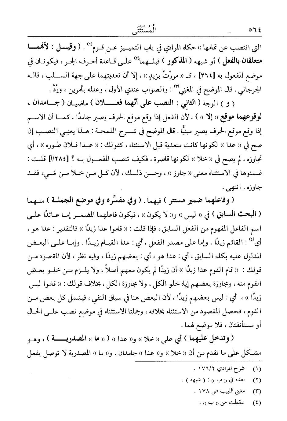"وفاعلهما ضمير مستتر" فيهما. "وفي مفسره وفي موضع الجملة" منهما "البحث السابق" في "ليس" و"لا يكون"، فيكون فاعلهما المضمر إما عائدًا على اسم الفاعل المفهوم من الفعل السابق, فإذا قلت: "قاموا عدا زيدً" فالتقدير: عدا هو، أي4: القائم زيدًا، وإما على مصدر الفعل، أي: عدا القيام زيدًا، وإما على البعض المدلول عليه بكله السابق، أي: عدا هو، أي: بعضهم زيدًا، وفيه نظرًا؛ لأن المقصود من قولك: "قام القوم عدا زيدًا" أن زيدا لم يكون معهم أصلا، ولا يلزم من خلو بعض القوم منه، ومجاوزة بعضهم إياه خلو الكل، ولا مجاوزة الكل، بخلاف قولك: "قاموا ليس زيدًا"؛ لأن البعض هنا في سياق النفي, فيشمل كل بعض من القوم, فحصل المقصود من الاستثناء بخلافه، وجملتا الاستثناء في موضع نصب على الحال أو مستأنفتان، فلا موضع لهما.
