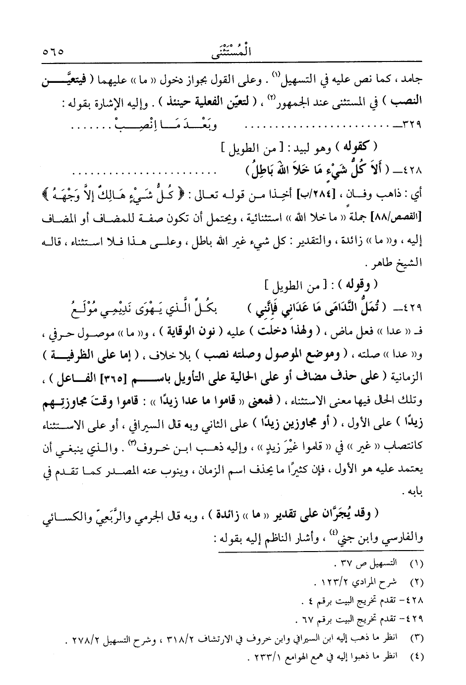 جامد، كما نص عليه في التسهيل1. وعلى القول بجواز دخول "ما" عليهما "فيتعين النصب" في المستثنى عند الجمهور2، "لتعين الفعلية حينئذ". وإليه الإشارة بقوله: