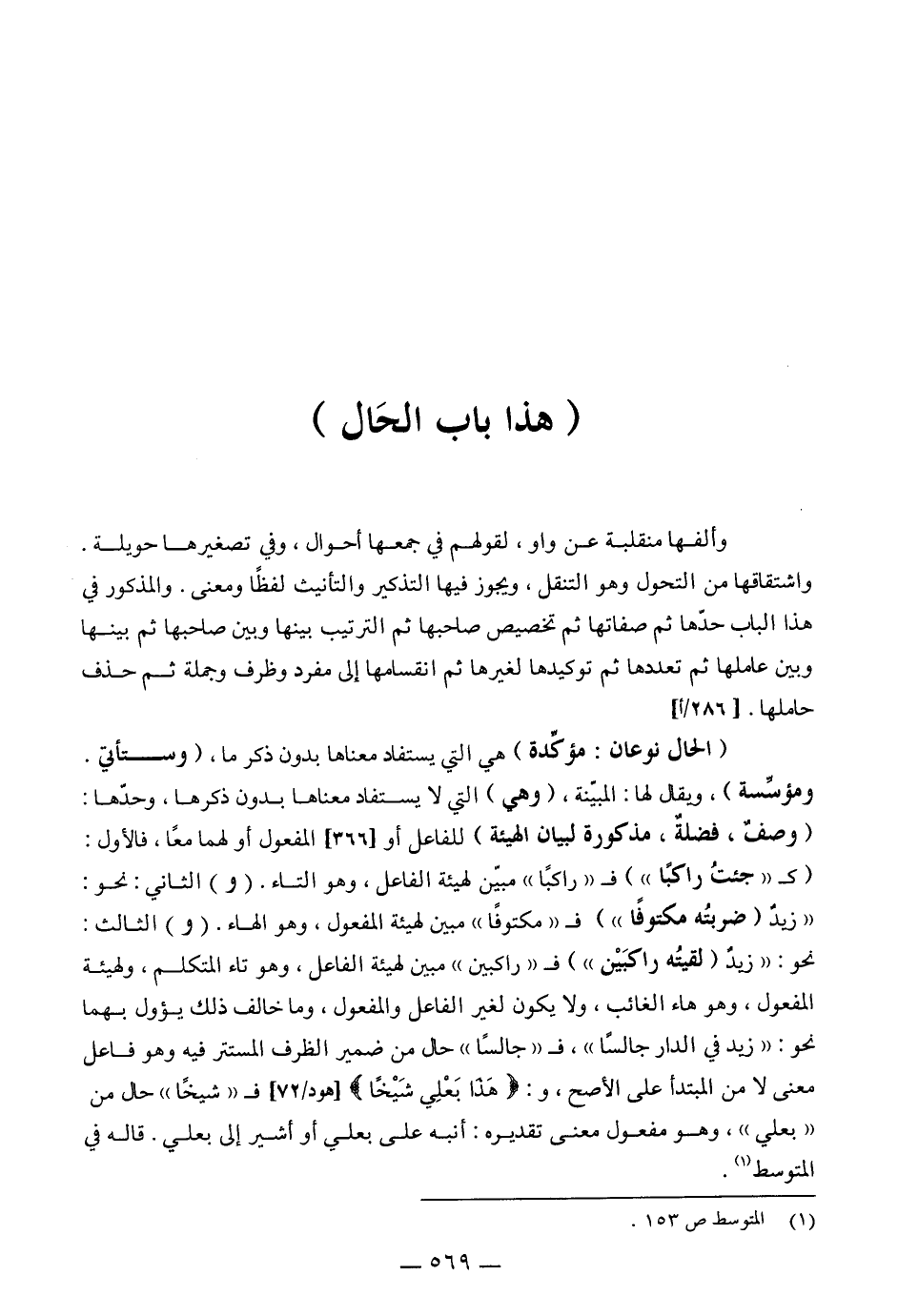 وألفها منقلبة عن واو، لقولهم في جمعها أحوال، وفي تصغيرها حويلة، واشتقاقها من التحول وهو التنقل، ويجوز فيها التذكير والتأنيث لفظًا ومعنى, والمذكور في هذا الباب حدها ثم صفاتها ثم تخصيص صاحبها ثم الترتيب بينها وبين صاحبها ثم بينها وبين عاملها ثم تعددها ثم توكيدها ثم انقسامها إلى مفرد وظرف وجملة ثم حذف حاملها.