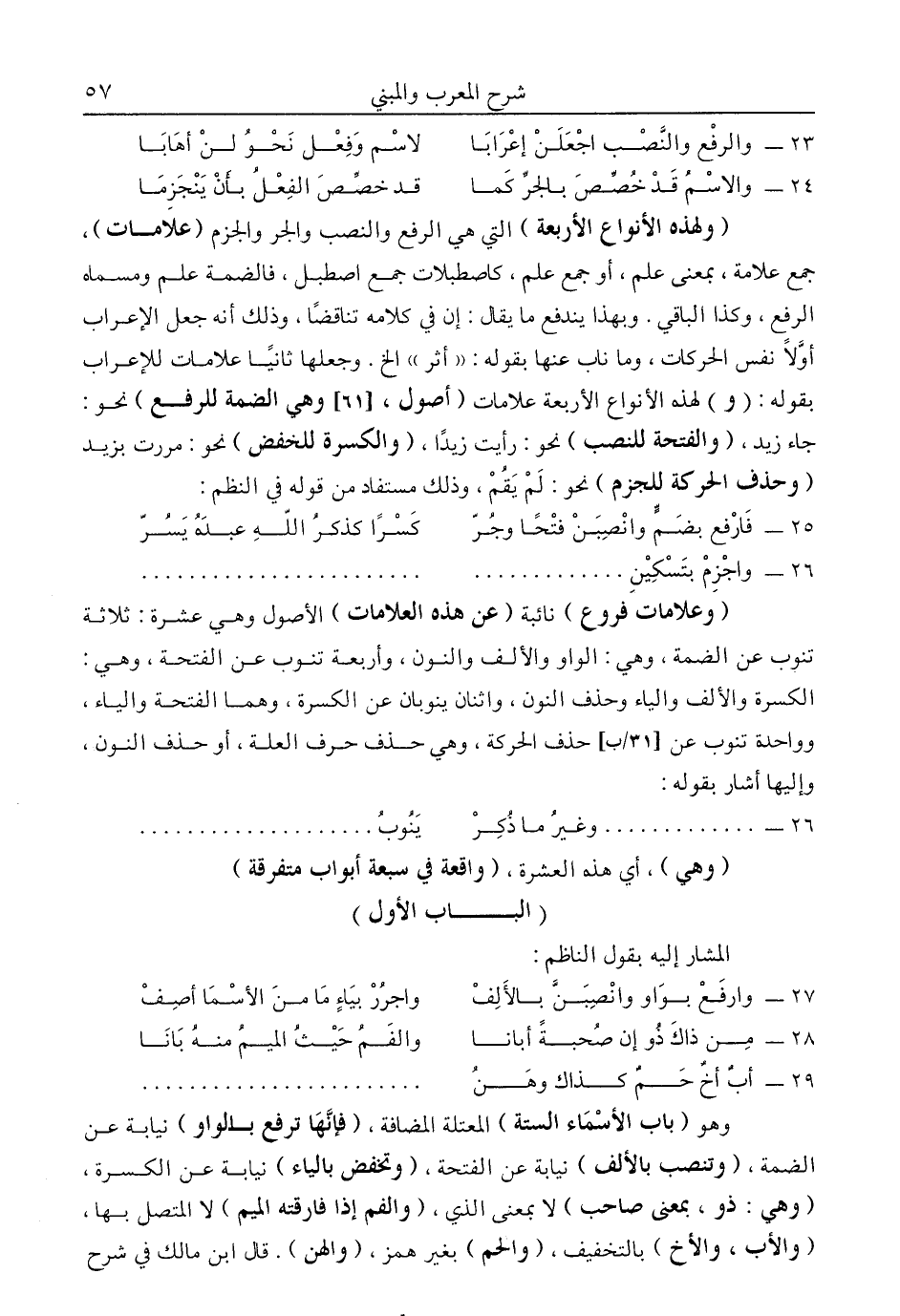 "وعلامات فروع" نائبة "عن هذه العلامات" أصول وهي عشرة: ثلاثة تنوب عن الضمة، وهي: الواو والألف والنون، وأربعة تنوب عن الفتحة، وهي: الكسرة والألف والياء وحذف النون، واثنان ينوبان عن الكسرة، وهما الفتحة والياء، وواحدة تنوب عن حذف الحركة، وهي حذف حرف العلة، أو حذف النون، وإليها أشار بقوله: