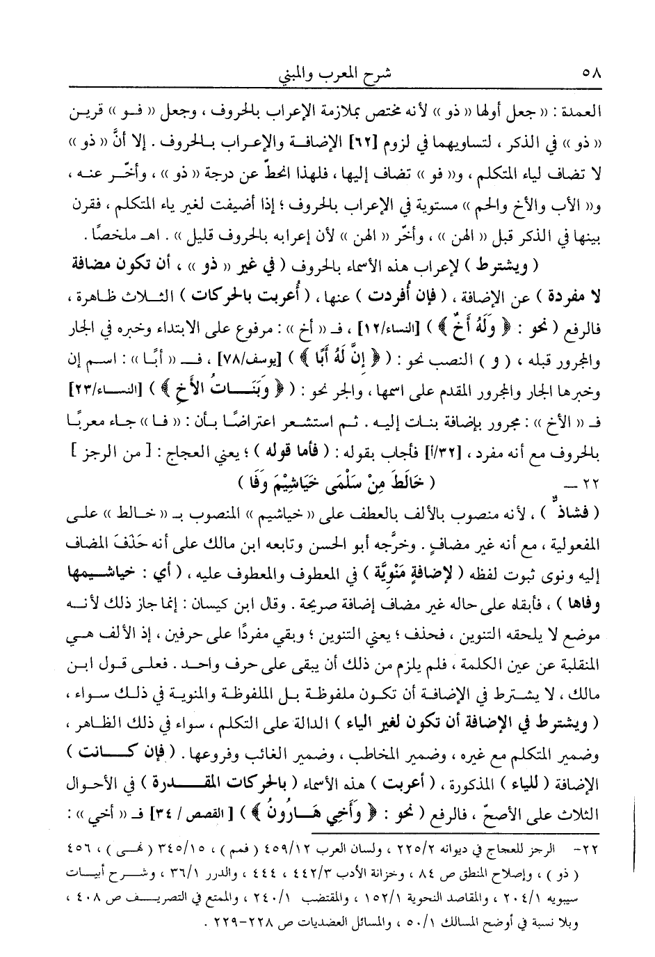 "ويشترط" لإعراب هذه الأسماء بالحروف "في غير "ذو"، أن تكون مضافة لا مفردة" عن الإضافة، "فإن أفردت" عنها، "أعربت بالحركات" الثلاث ظاهرة، فالرفع "نحو: {وَلَهُ أَخٌ} [النساء: 12] ، فـ"أخ": مرفوع على الابتداء وخبره في الجار والمجرو قبله، "و" النصب نحو: " {إِنَّ لَهُ أَبًا} [يوسف: 78] ، فـ"أبا": اسم إن وخبرها الجار والمجرور المقدم على اسمها، والجر نحو: " {وَبَنَاتُ الْأَخِ} [النساء: 23] قد "الأخ": مجرور بإضافة بنات إليه. ثم استشعر اعتراضا بأن: "فا" جاء معربا بالحروف مع أنه مفرد، فأجاب بقوله: "فأما قوله؛ يعني العجاج: [من الرجز]