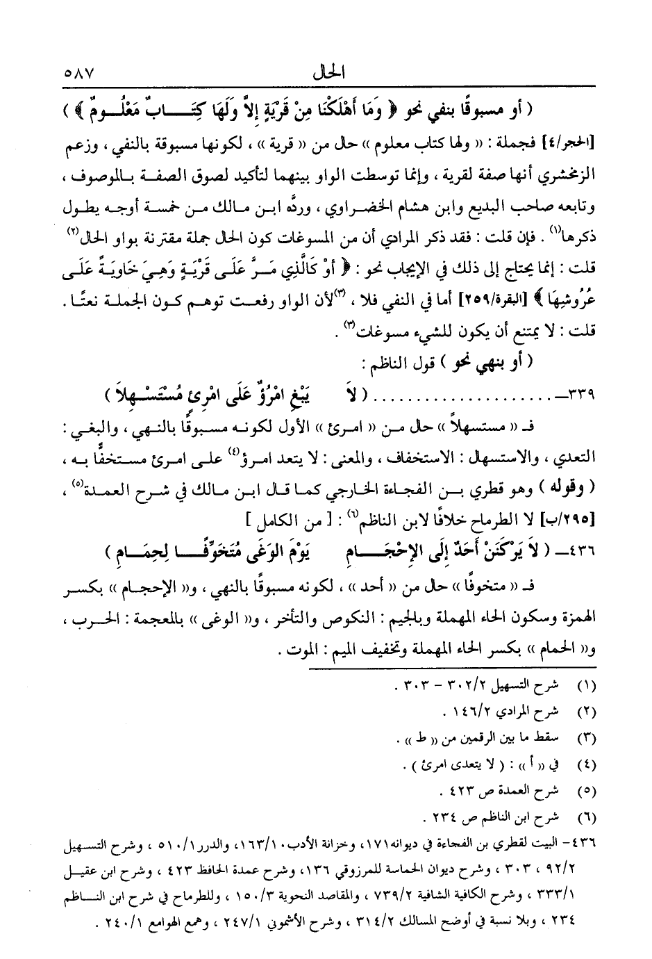 "أو مسبوقًا بنفي نحو: {وَمَا أَهْلَكْنَا مِنْ قَرْيَةٍ إِلَّا وَلَهَا كِتَابٌ مَعْلُومٌ} " [الحجر: 4] فجملة: "ولها كتاب معلوم" حال من "قرية"، لكونها مسبوقة بالنفي، وزعم الزمخشري أنها صفة لقرية، وإنما توسطت الواو بينهما لتأكيد لصوق الصفة بالموصوف، وتابعه صاحب البديع وابن هشام الخضراوي، ورده ابن مالك من خمسة أوجه يطول ذكرها1. فإن قلت: فقد ذكر المرادي أن من المسوغات كون الحال جملة مقترنة بواو الحال2 قلت: إنما يحتاج إلى ذلك في الإيجاب نحو: {أَوْ كَالَّذِي مَرَّ عَلَى قَرْيَةٍ وَهِيَ خَاوِيَةٌ عَلَى عُرُوشِهَا} [البقرة: 259] أما في النفي فلا؛ [لأن الواو رفعت توهم كون الجملة نعتًا، قلت: لا يمتنع أن يكون للشيء مسوغات] 3.