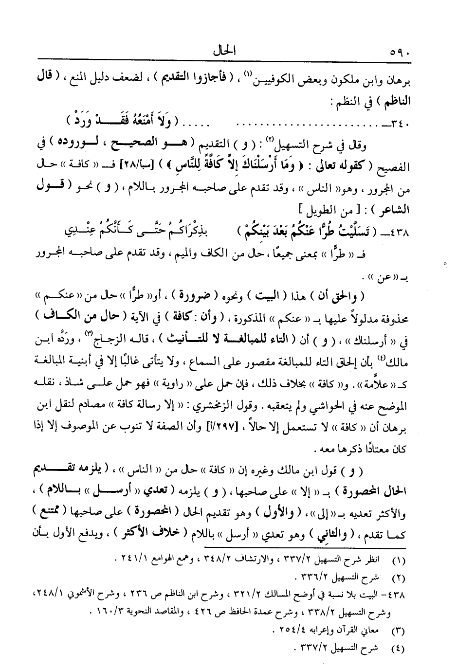 "و" قول ابن مالك وغيره إن "كافة" حال من "الناس"، "يلزمه تقديم الحال المحصورة" بـ"إلا" على صاحبها "و" يلزمه "تعدي "أرسل" باللام"، والأكثر تعديه بـ"إلى"، "والأول" وهو تقديم الحال"المحصورة" على صاحبها "ممتنع كما تقدم، "والثاني" وهو تعدي" أرسل" باللام "خلاف الأكثر" ويدفع الأول بأن