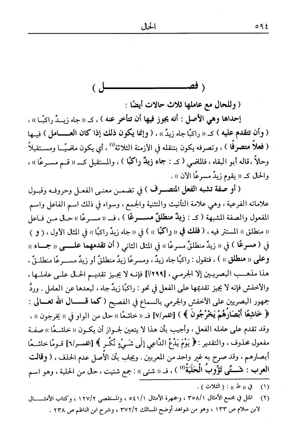 "أو صفة تشبه الفعل المتصرف" في تضمن معنى الفعل وحروفه وقبول علاماته الفرعية، وهي علامة التأنيث والتثنية والجمع، وسواء في ذلك اسم الفاعل واسم المفعول والصفة المشبهة "كـ: "زيد منطلق مسرعًا"، فـ"مسرعًا" حال من فاعل "منطلق" المستتر فيه، "فلك في "راكبًا"" في "جاء زيد راكبًا" في المثال الأول، "و" في "مسرعًا" في "زيد منطلق مسرعًا" في المثال الثاني "أن تقدمهما على "جاء" وعلى "منطلق""، فتقول: راكبًا جاء زيد، ومسرعًا زيد منطلق أو زيد مسرعًا منطلق، هذا مذهب البصريين إلا الجرمي، فإنه لا يجيز تقديم الحال على عاملها، والأخفش فإنه لا يجيز تقديمها على الفعل في نحو: راكبًا زيد جاء، لبعدها عن العامل. ورد جمهور البصريين على الأخفش والجرمي بالسماع في الفصيح "كما قال الله تعالى: {خُشَّعًا أَبْصَارُهُمْ يَخْرُجُونَ} [القمر: 7] فـ"خاشعًا" حال من الواو في "يخرجون"، وقد تقدم على عامله الفعل، وأجيب بأن هذا لا يتعين لجواز أن يكون "خاشعًا" صفة مفعول محذوف، والتقدير: {يَوْمَ يَدْعُ الدَّاعِ إِلَى شَيْءٍ نُكُرٍ} [القمر: 6] قومًا خاشعا أبصارهم، وقد صرح به غير واحد من المعربين، ويجاب بأن الأصل عدم الحذف، "وقالت العرب: شتى تئوب الحلبة2"، فـ"شتى": جمع شتيت، حال من الحلبة، وهم اسم