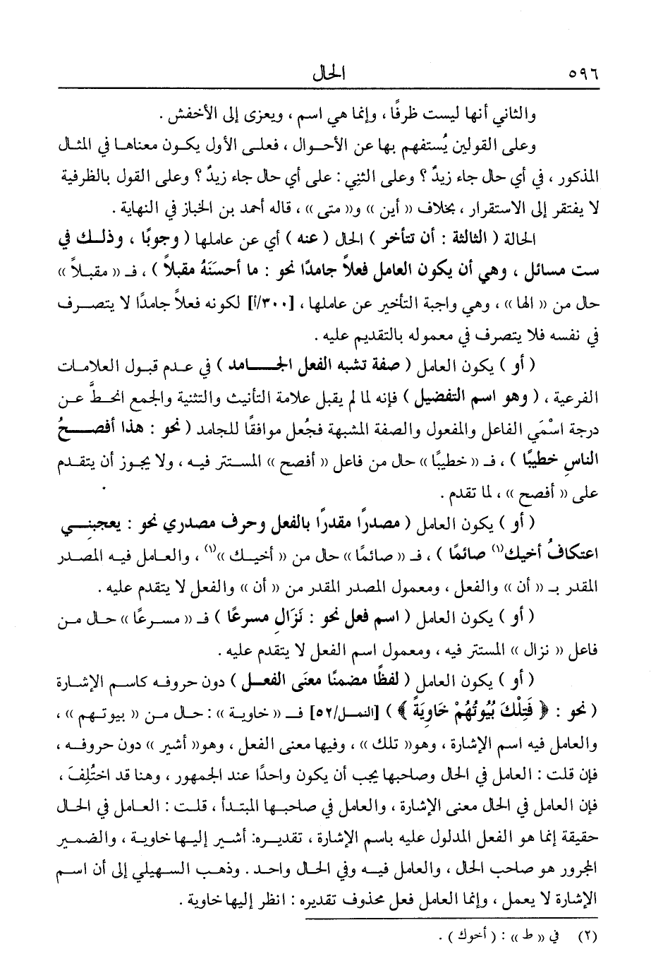 "أو" يكون العامل "مصدرًا مقدرًا بالفعل وحرف مصدري نحو: يعجبني اعتكاف أخيك1 صائمًا"، فـ"صائمًا" حال من "أخيك"1, والعامل فيه المصدر المقدر بـ"أن" والفعل, ومعمول المصدر المقدر من "أن" والفعل لا يتقدم عليه.